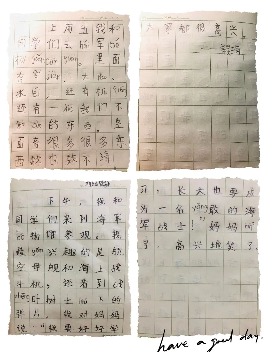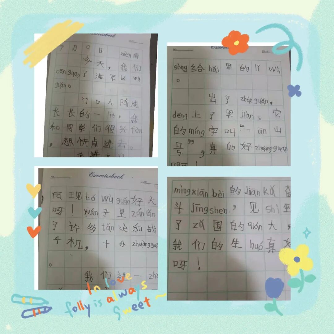 周沐澤:今天,我們參觀了海軍博物館。里面展覽了許多坦克和戰(zhàn)斗機,真是壯觀。還展出了海軍的歷史,革命先烈的遺物。通過這次參觀,我學(xué)到了革命先輩的艱苦奮斗精神,見識到了祖國的強大,我們的生活真好呀!