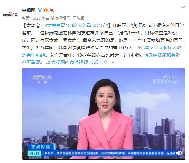 【太離譜!女生身高168追求體重30公斤】在韓國,“瘦”已經成為很多人的日常追求。一位極端減肥的韓國網友這樣介紹自己,“身高1米68,目標體重是30公斤,同時有厭食癥、暴食癥”。最令人驚訝的是,她是一個今年要參加高考的高三學生。近五年間,韓國因飲食障礙接受治療的有4.6萬人,韓國女性厭食癥人數是男性4倍。女性患者中,10歲至20歲占比最大,達14.4%。