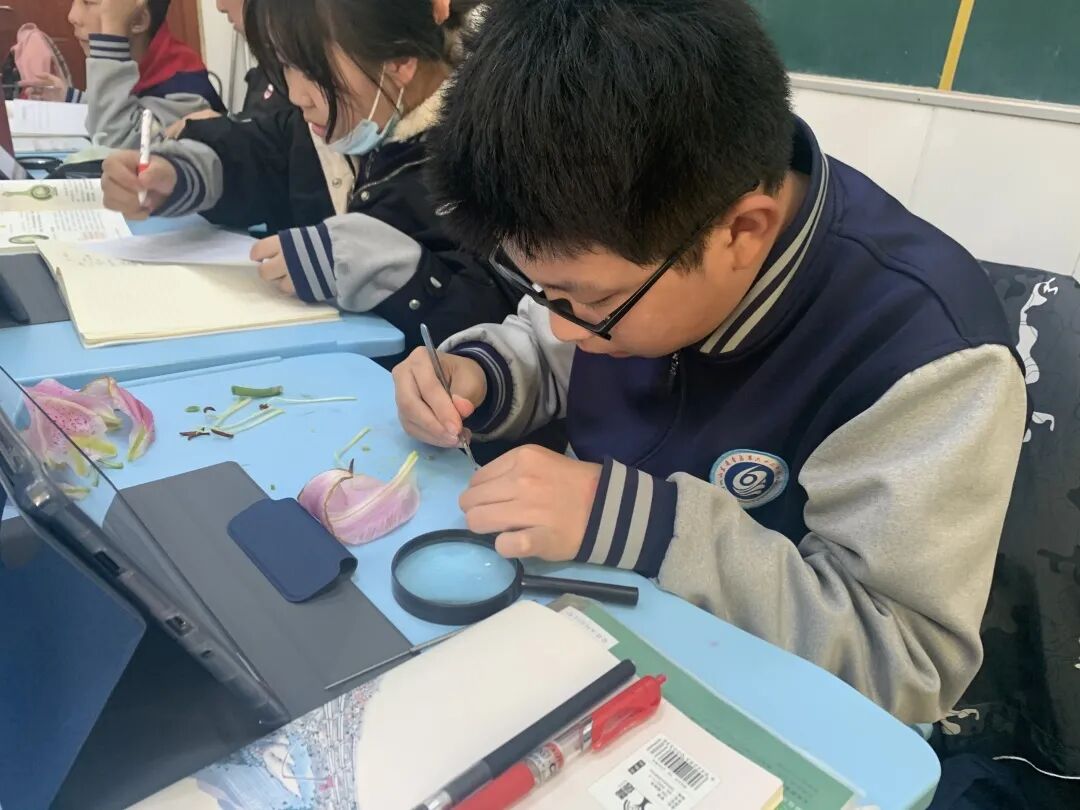 學校以學科組為單位進行主題教研,探究、發現、梳理出與勞動教育有關的知識點和實驗項目。在道德與法治課堂上跟學生講述“工匠精神”、“勞動最光榮、勞動最崇高”等內容,闡述勞動價值的內涵和意義。理科老師帶領學生利用物理、化學、生物等課堂上學到的知識,研究光照對葡萄生長的影響,探究韭菜肥力的最佳配比……鼓勵學生在真實的勞動情境中解決問題。