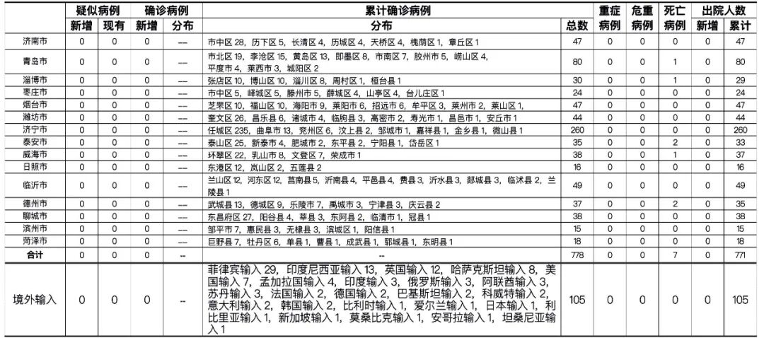 山東無新增本地疑似病例、確診病例。累計報告確診病例778例,死亡7例,治愈出院771例。