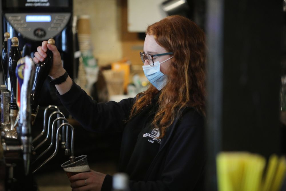 2020年7月4日,英國溫切斯特一家酒吧的工作人員在接啤酒。(新華社發,蒂姆·愛爾蘭攝)
