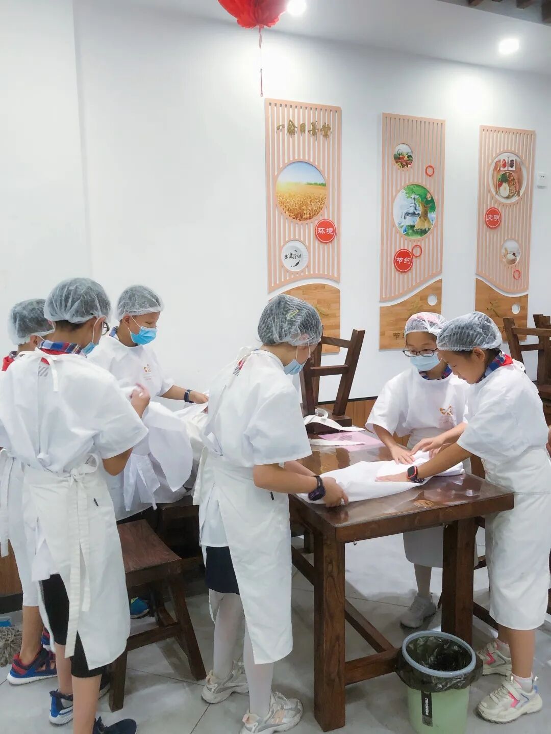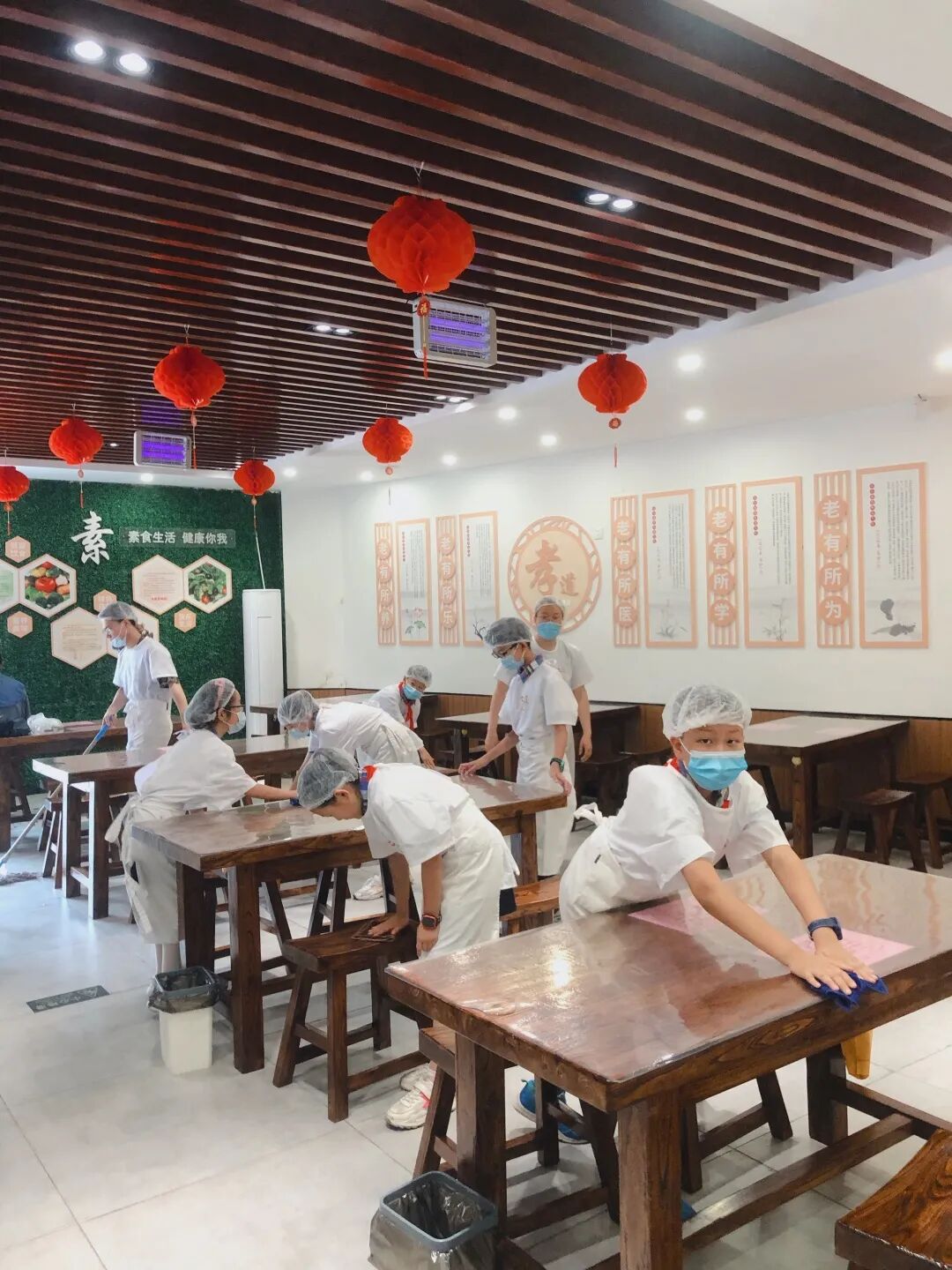 隊員們換上統一服裝,店長做任務分配,隊員們打掃前廳衛生,媽媽們則幫助廚師備菜。隊員們拿著手中的抹布細細清理桌椅的每個角落,只為給爺爺奶奶們提供更加衛生清潔的用餐環境。媽媽們則幫助廚師備菜,在“咚咚咚”的菜板聲中,大頭菜、土豆、蕓豆、豆腐皮都被齊齊備好,志愿者們干勁十足,效率之高得到了店長和負責老師的一致表揚和肯定。