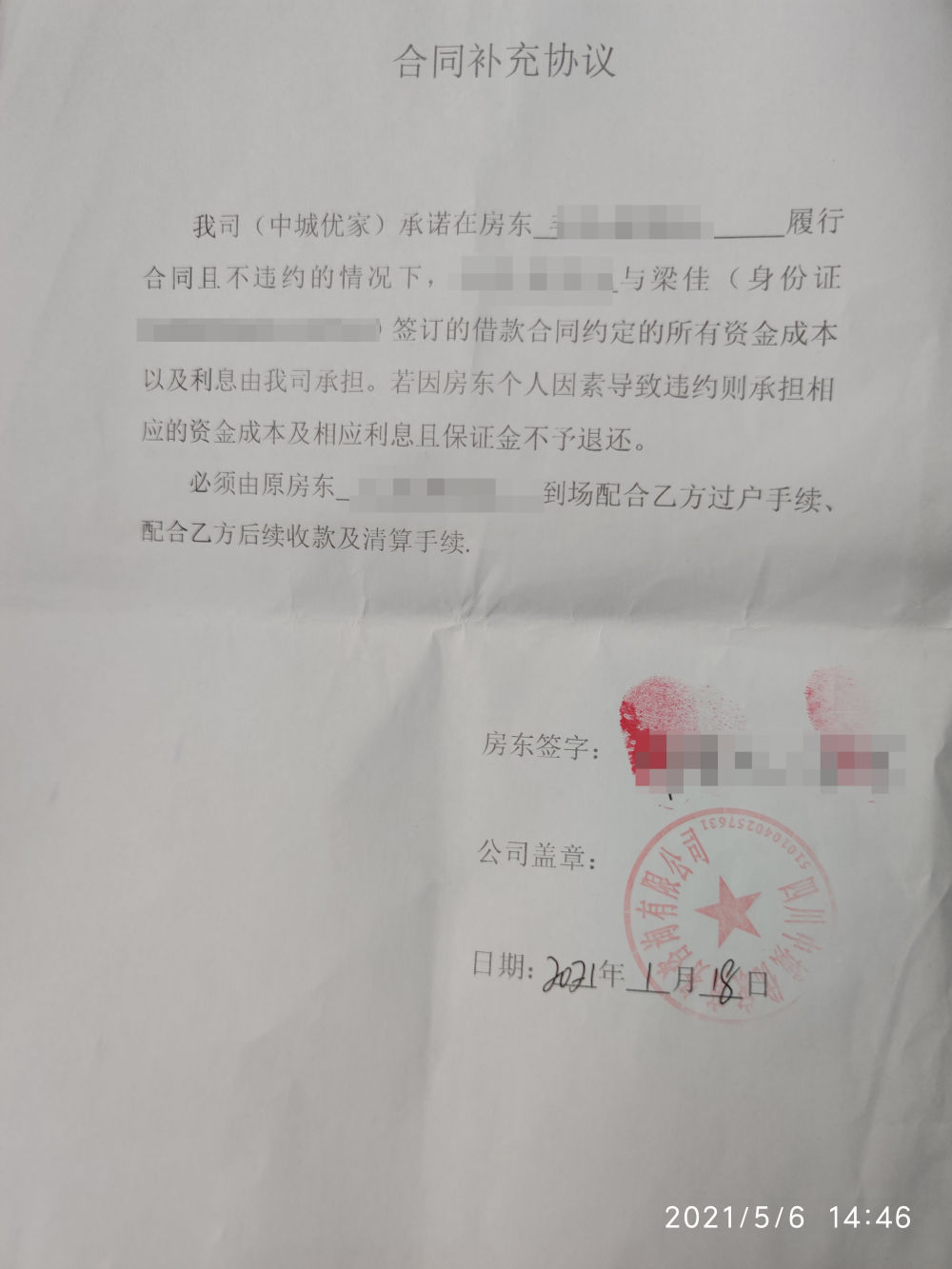 記者注意到,和前述借款合同同日簽署的還有一份補充協議,該協議約定,毛先生夫婦與梁女士簽訂的借款合同約定的所有資金成本及利息由中城優家公司承擔,但如因房東個人因素導致違約則承擔相應的資金成本及利息,保證金不予退還。