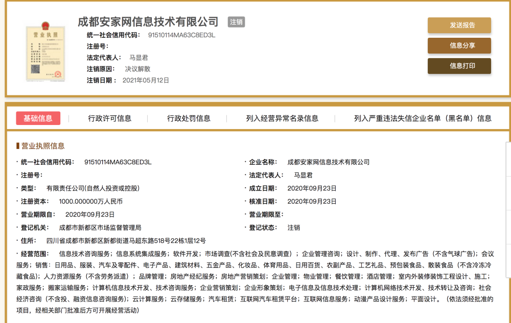 工商資料顯示,安家公司成立于2020年9月,注冊于成都市新都區市場監督管理局,目前已注銷。工商資料變更信息顯示,安家公司前任股東馬顯君曾任中城優家高管,2020年11月退出中城優家后于今年1月出任安家公司執行董事。