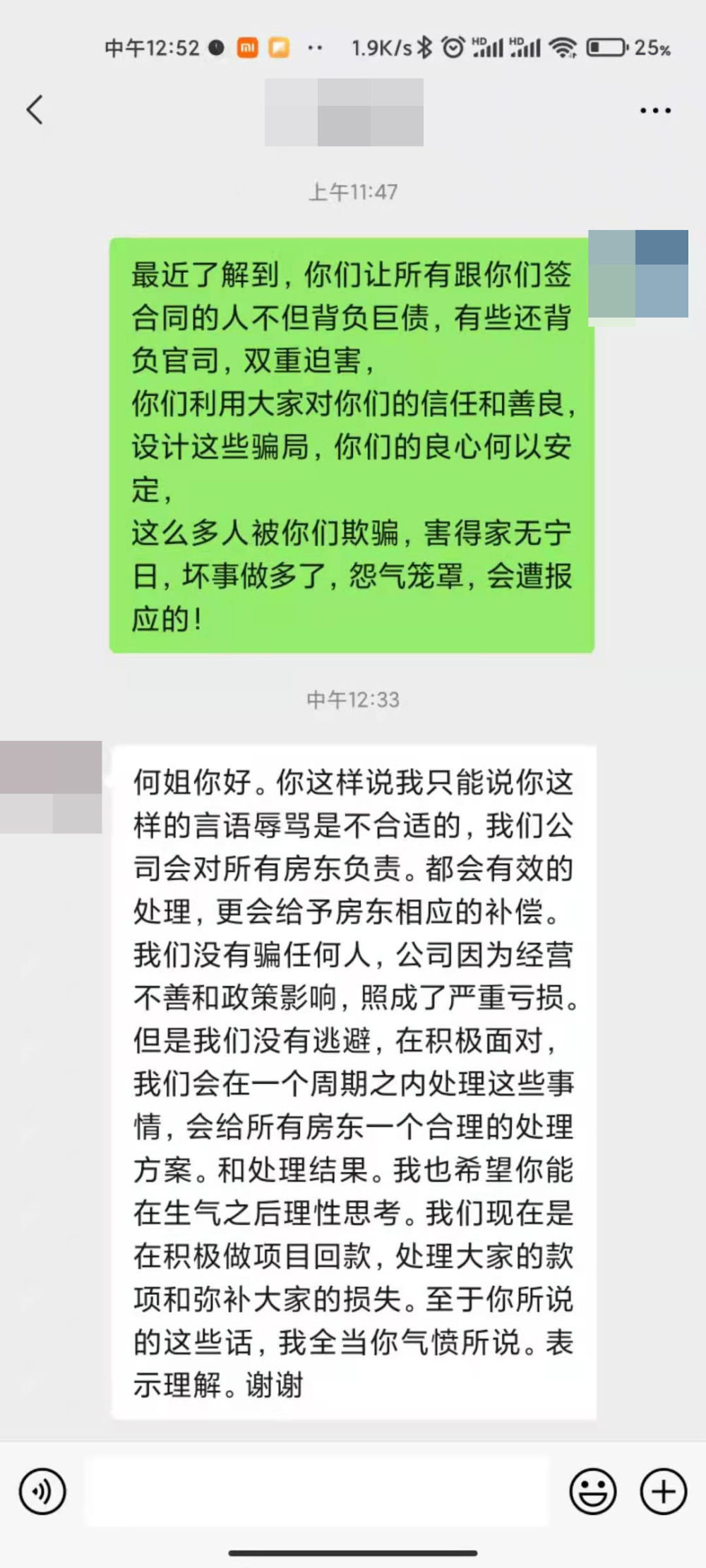 房主何女士向記者出示的微信溝通記錄顯示,中城優家董事長楊慧解釋稱,“公司因經營不善和政策影響,造成了嚴重虧損,但我們沒有逃避,在積極面對。”楊慧還稱,公司目前正在積極做項目回款,彌補此前已支付過押金的房東的損失。這令一些目前通過訴訟手段維權的房主憂心,他們即使勝訴,最終判決可能也無法執行成功。
