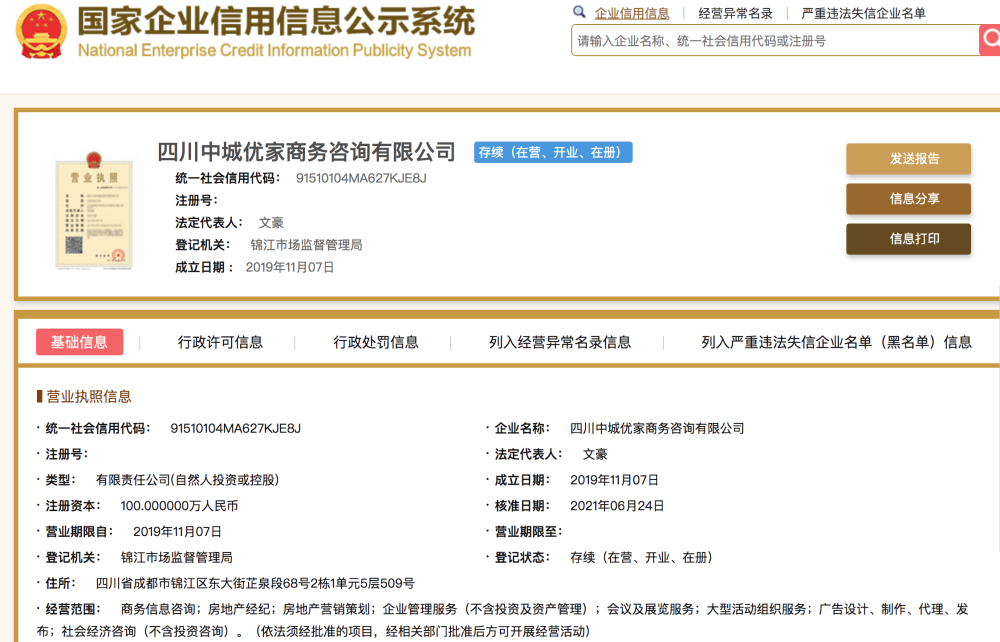 毛先生這才意識到,中城優家可能并沒有履行此前合同約定的能力。工商資料顯示,中城優家成立于2019年11月,注冊資金100萬元,在成都市錦江市場監督管理局登記注冊,經營范圍涉及商務信息咨詢、房地產經紀、房地產營銷策劃、企業管理服務和會議及展覽服務等。天眼查信息顯示,該公司的實繳資本和人員規模均不詳,參保人數顯示為0人。