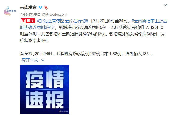 截至7月20日24時,我省現有確診病例267例(本土82例,境外輸入185例)、無癥狀感染者31例(本土2例,境外輸入29例),均在定點醫療機構隔離治療和醫學觀察。
