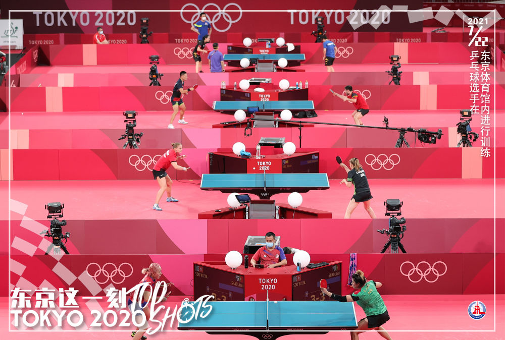 7月22日,乒乓球選手在東京體育館內進行訓練。新華社記者 王東震 攝;制圖:賈浩成