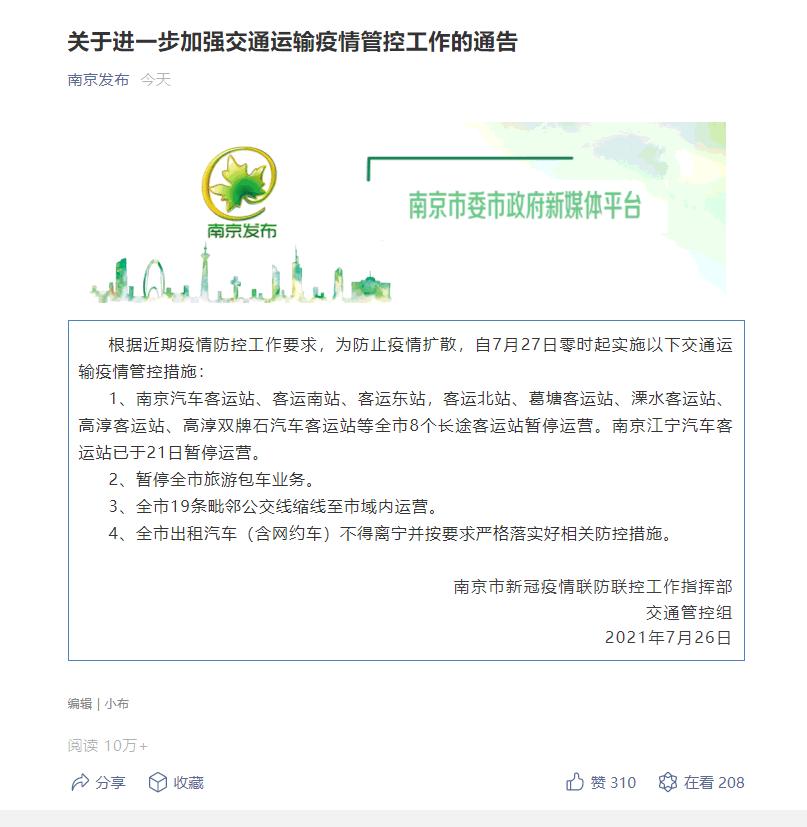 根據近期疫情防控工作要求,為防止疫情擴散,自7月27日零時起實施以下交通運輸疫情管控措施: