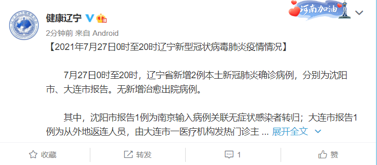 【2021年7月27日0時至20時遼寧新型冠狀病毒肺炎疫情情況】