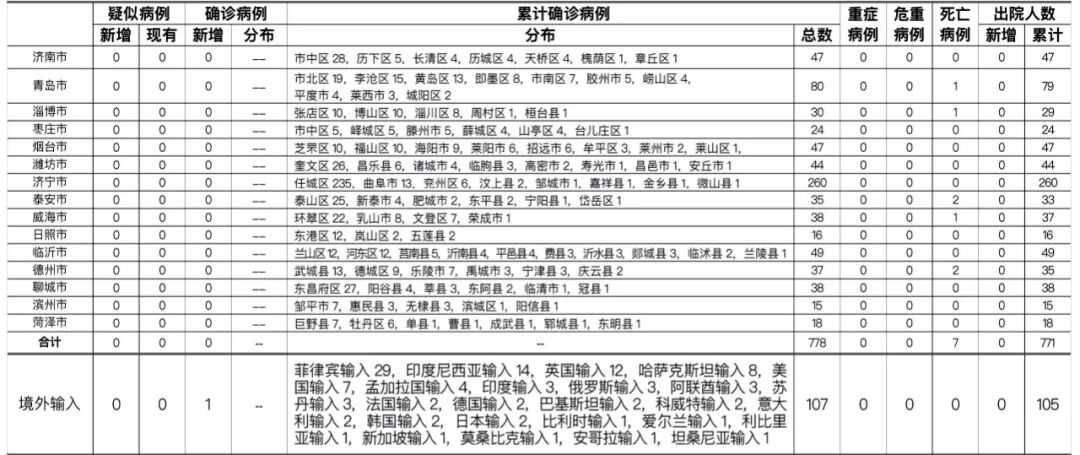 山東無(wú)新增本地疑似病例、確診病例。累計(jì)報(bào)告確診病例778例,死亡7例,治愈出院771例。