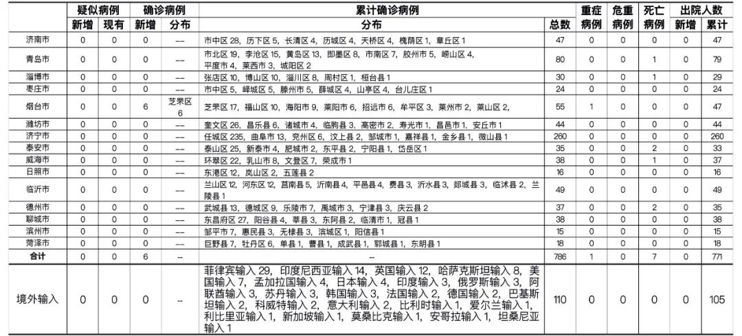 山東省本地病例按確診時醫院所在縣區統計,境外輸入病例單獨統計。