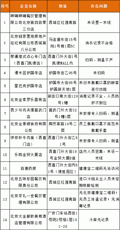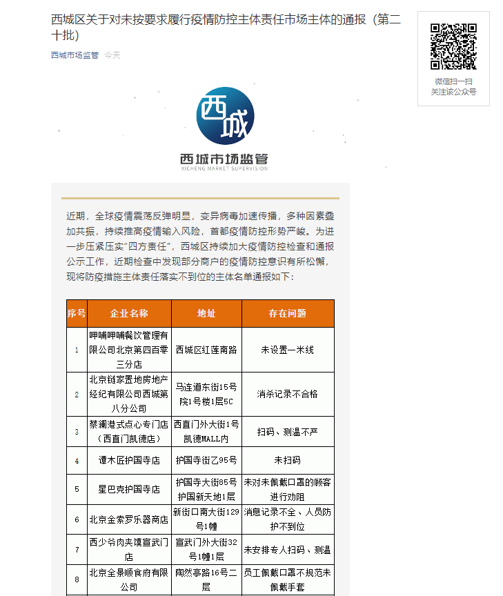 近期,全球疫情震蕩反彈明顯,變異病毒加速傳播,多種因素疊加共振,持續(xù)推高疫情輸入風(fēng)險,首都疫情防控形勢嚴(yán)峻。為進(jìn)一步壓緊壓實(shí)“四方責(zé)任”,(北京市)西城區(qū)持續(xù)加大疫情防控檢查和通報公示工作,近期檢查中發(fā)現(xiàn)部分商戶的疫情防控意識有所松懈,現(xiàn)將防疫措施主體責(zé)任落實(shí)不到位的主體名單通報如下: