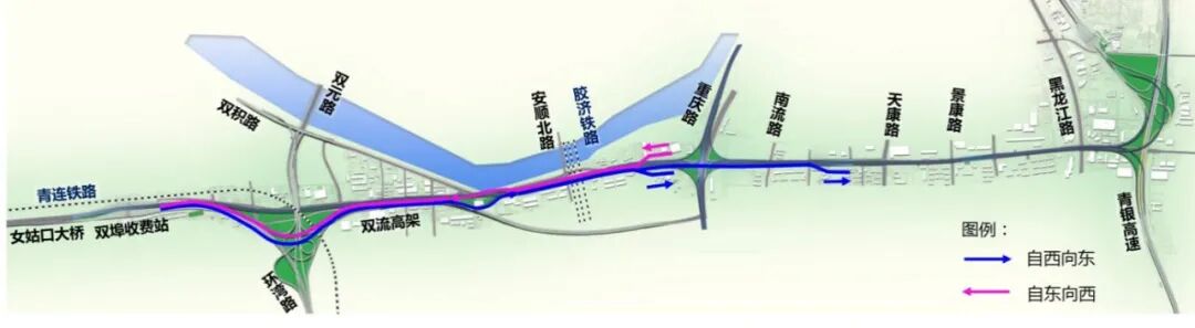 雙向4車道,設計時速100km/h,不收取高速通行費。市民駕駛車輛,自西向東可不經停雙埠收費站,直接進入中間的高架車道,途經新機場高速連接線(雙埠-夏莊段)、新建的夏莊互通立交駛往青銀高速、青新高速;自東向西可通過青島東、李村、城陽南等收費站,途經青銀高速、青新高速、新機場高速連接線(雙埠-夏莊段)、青蘭高速去往膠東國際機場。