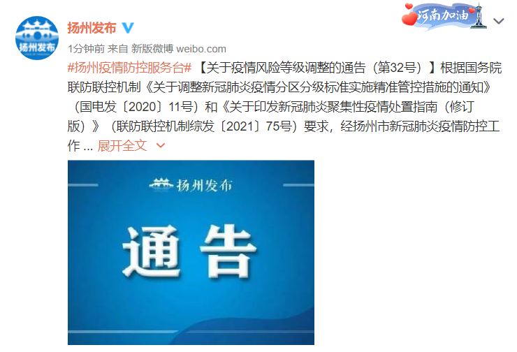 【關于疫情風險等級調整的通告(第32號)】根據國務院聯防聯控機制《關于調整新冠肺炎疫情分區分級標準實施精準管控措施的通知》(國電發〔2020〕11號)和《關于印發新冠肺炎聚集性疫情處置指南(修訂版)》(聯防聯控機制綜發〔2021〕75號)要求,經揚州市新冠肺炎疫情防控工作指揮部研究,自發布之日起,對揚州市部分區域疫情風險等級進行調整:
