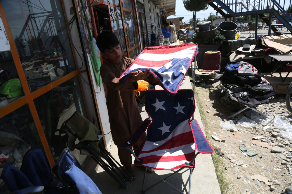 7月3日,在阿富汗帕爾萬省的巴格拉姆空軍基地附近,當?shù)鼐用裨诿儡娺z留下的物品中回收廢舊物。(新華社發(fā)拉赫馬圖拉·阿里扎達攝)