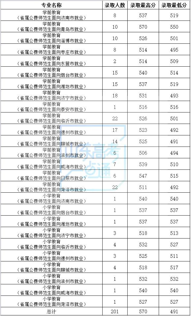 山東女子學院今年公費師范生招生201人,最高分570分(學前教育專業面向青島市就業),最低分491分(學前教育專業面向聊城市就業)