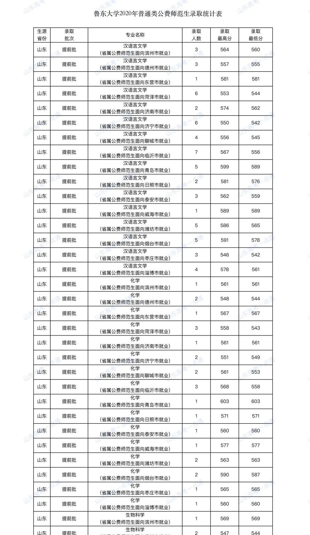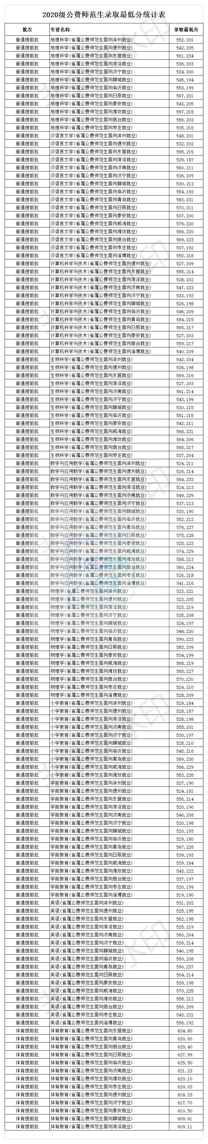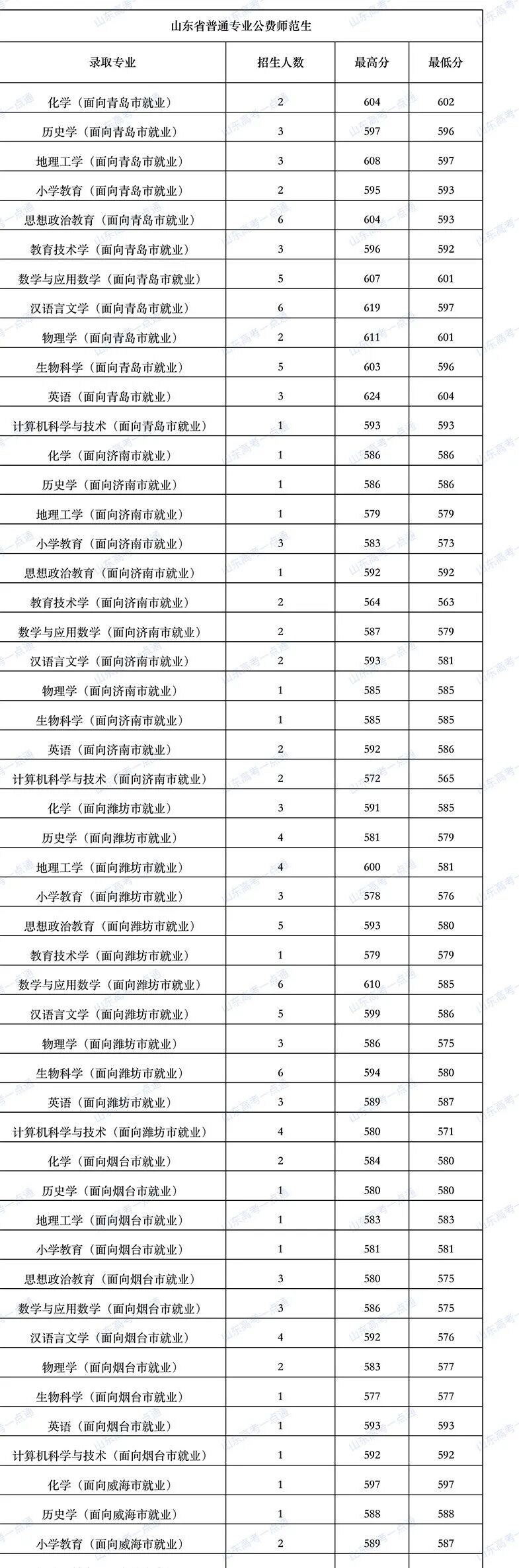 山東師范大學2020年面向山東省16地市招收483名公費師范生。其中,普通類錄取414人,最高分635分(超特殊類型控制線103分),位次8937名,最低分571分(超特殊類型控制線39分),位次54203名;