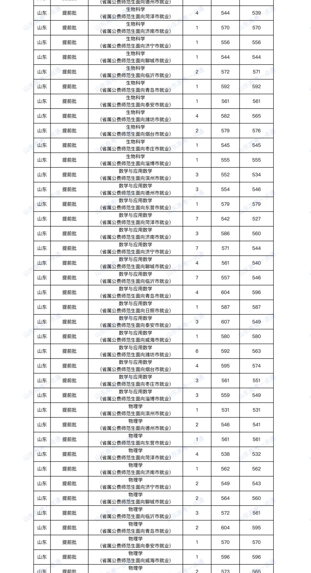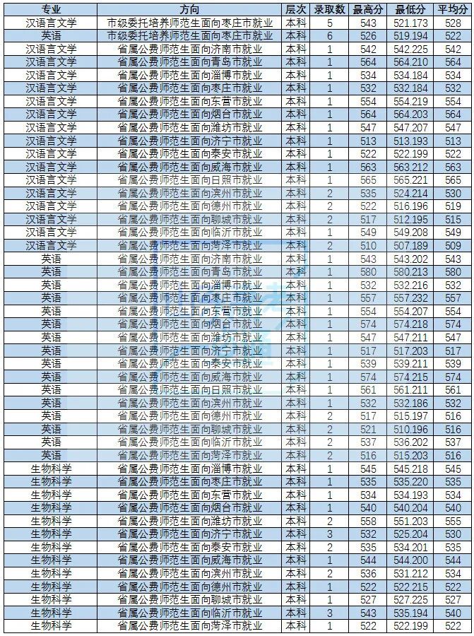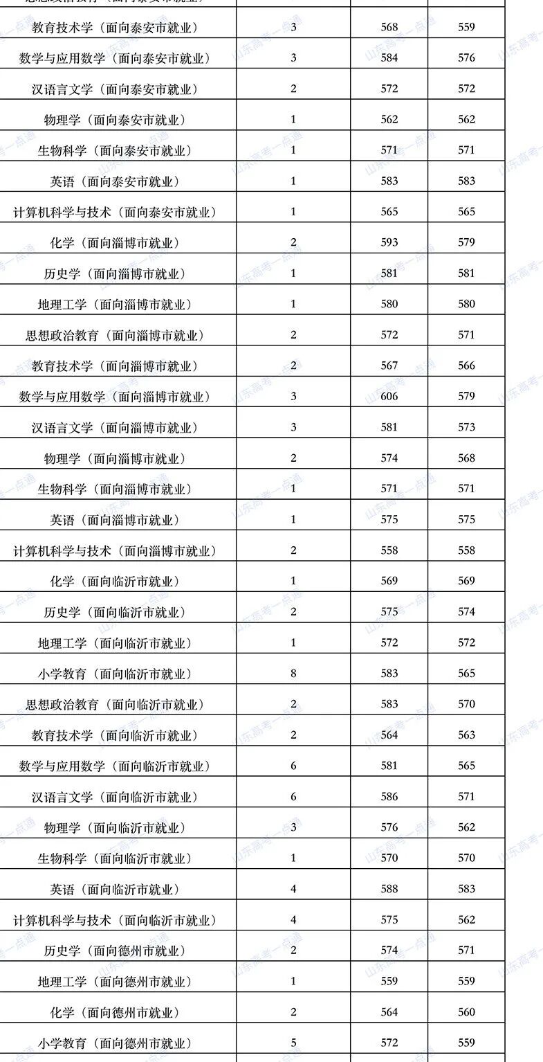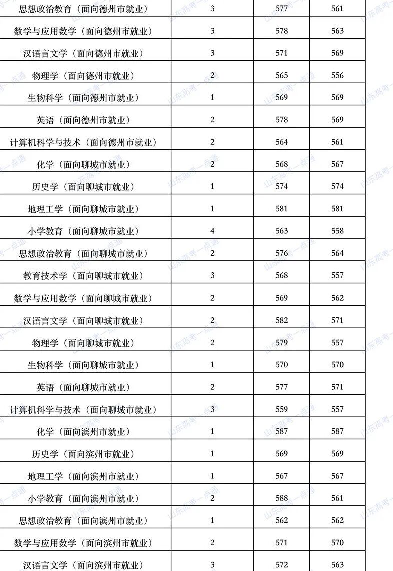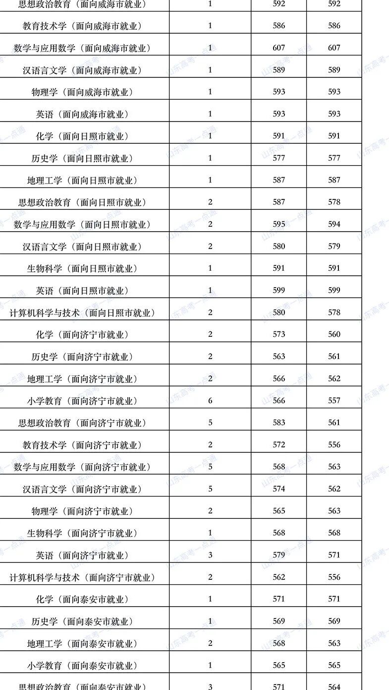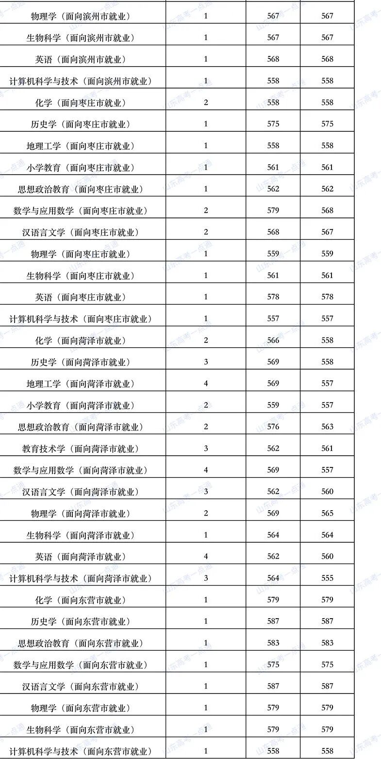 最低分為面向菏澤就業的計算機科學與技術專業考生,分數為555分。其次為面向德州就業的物理專業和面向濟寧就業的教學技術、計算機科學與技術專業,分數都為556分。