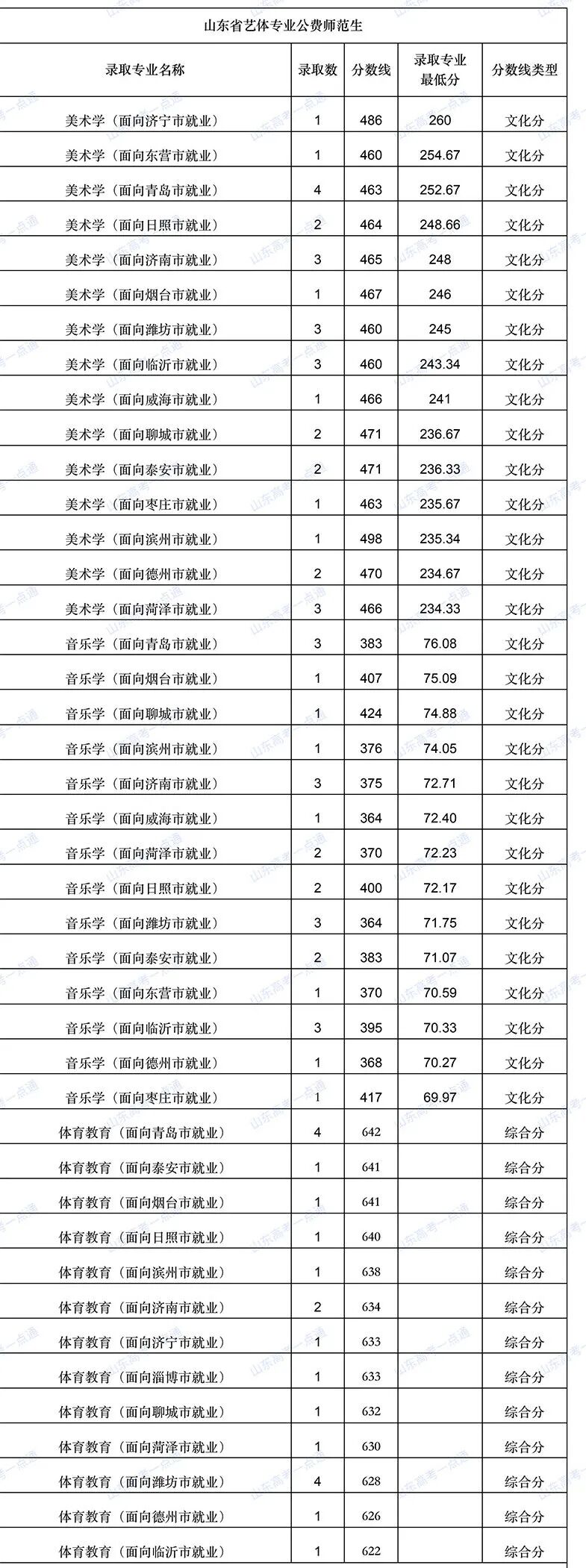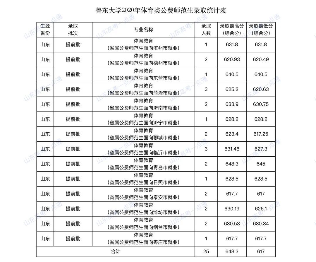 魯東大學體育類公費師范生最高分(綜合分)來自于面向青島就業的648.3分,最低分(綜合分)來自于面向泰安就業的617分。