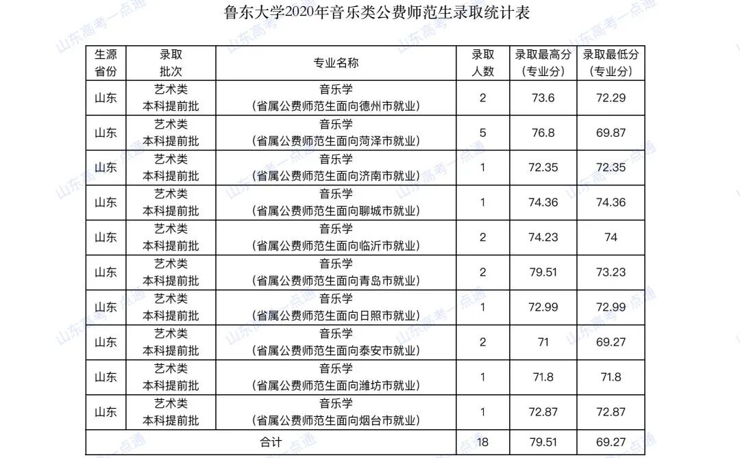 魯東大學音樂類公費師范生最高分(專業分)79.51分(面向青島就業),最低分(專業分)69.27(面向泰安就業)。