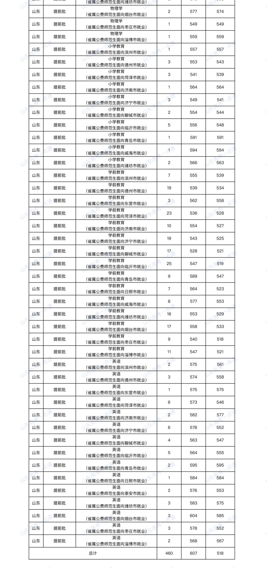 2020年,魯東大學普通類公費師范生共錄取460名,錄取最高分前為607分(數學與數學應用專業面向泰安市就業),最低分低為518(學前教育專業 面向棗莊市就業)。