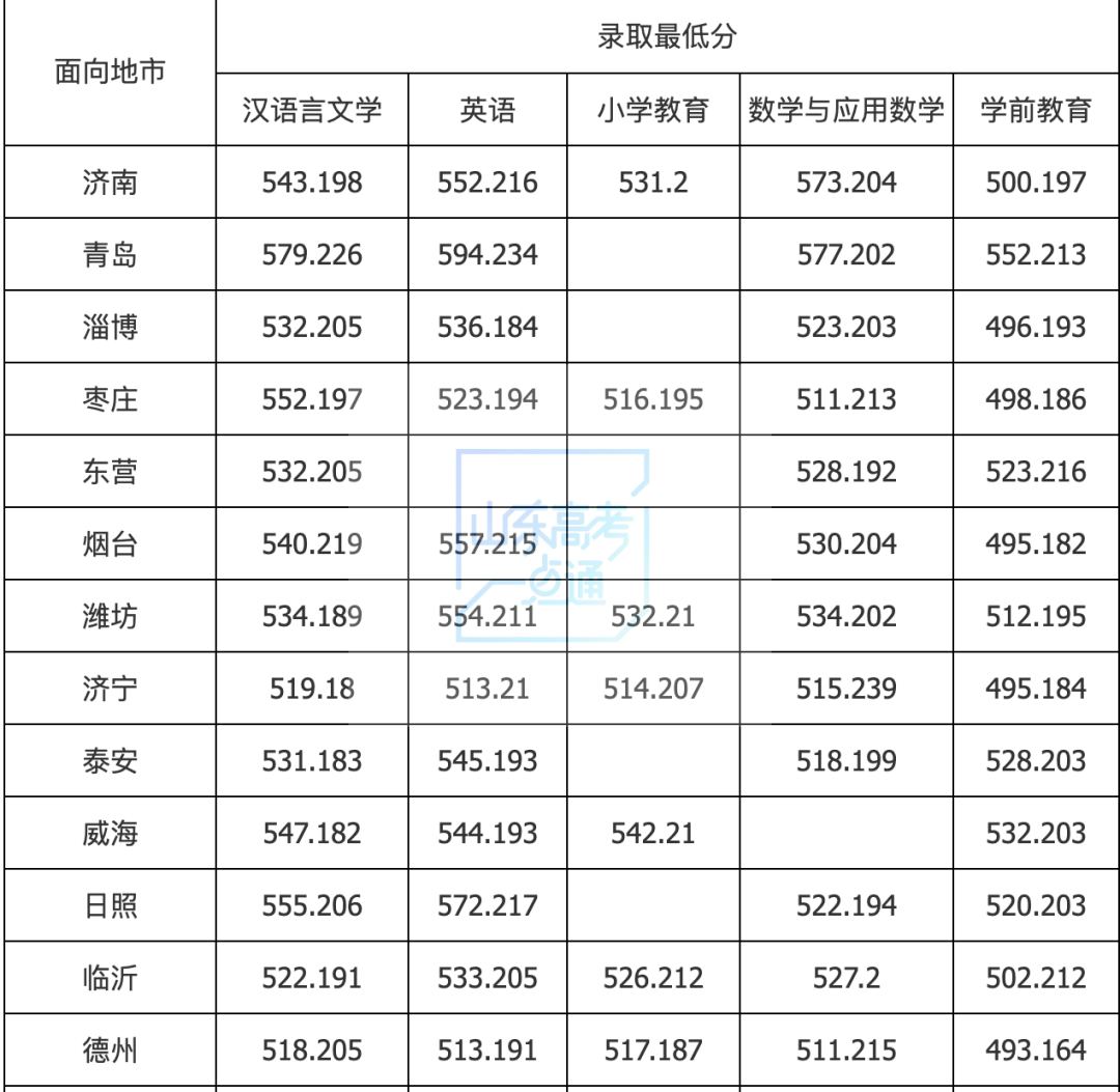 錄取平均分最低的后三名分別是學前教育專業的三個城市,德州538.2分、菏澤536.4分、棗莊536.3分。