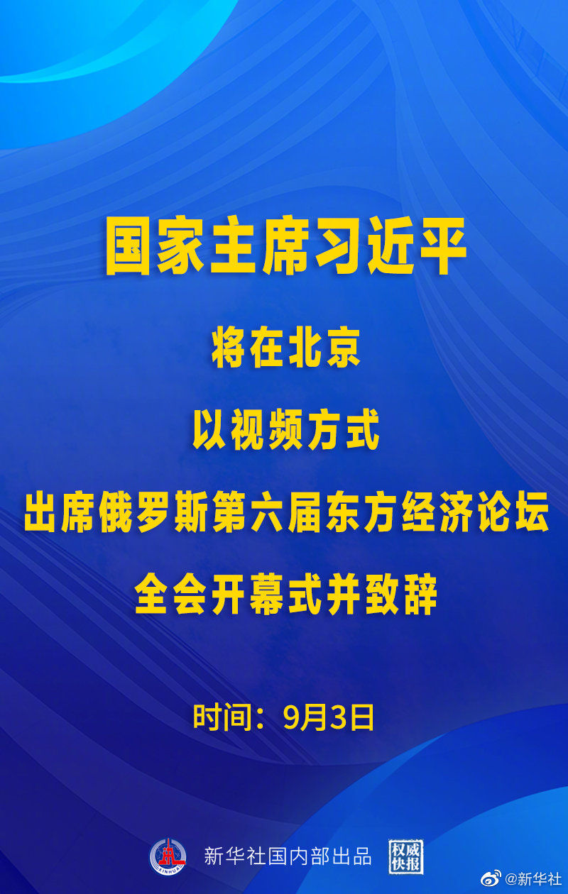 【權威快報丨習近平將出席俄羅斯第六屆東方經(jīng)濟論壇全會開幕式】外交部發(fā)言人華春瑩9月2日宣布:應俄羅斯聯(lián)邦總統(tǒng)普京邀請,國家主席習近平將于9月3日在北京以視頻方式出席俄羅斯第六屆東方經(jīng)濟論壇全會開幕式并致辭。
