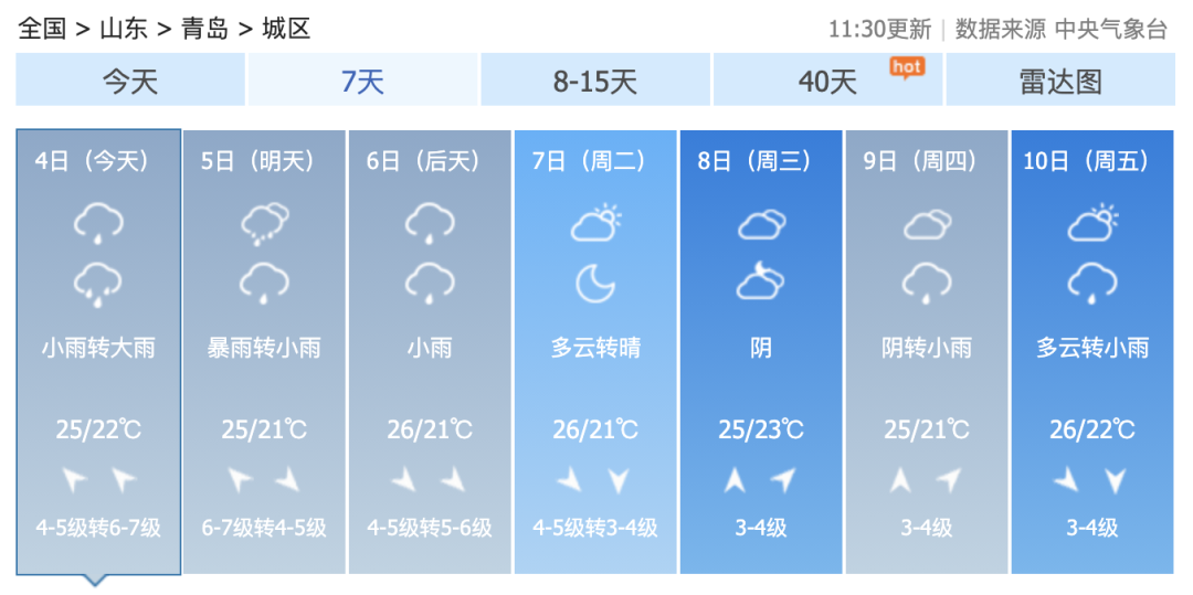 5日(周日)白天,預計全市范圍將出現大雨到暴雨,局部地區會達到大暴雨,市區、嶗山區、西海岸新區的局部地區極有可能出現大暴雨量級的降雨。