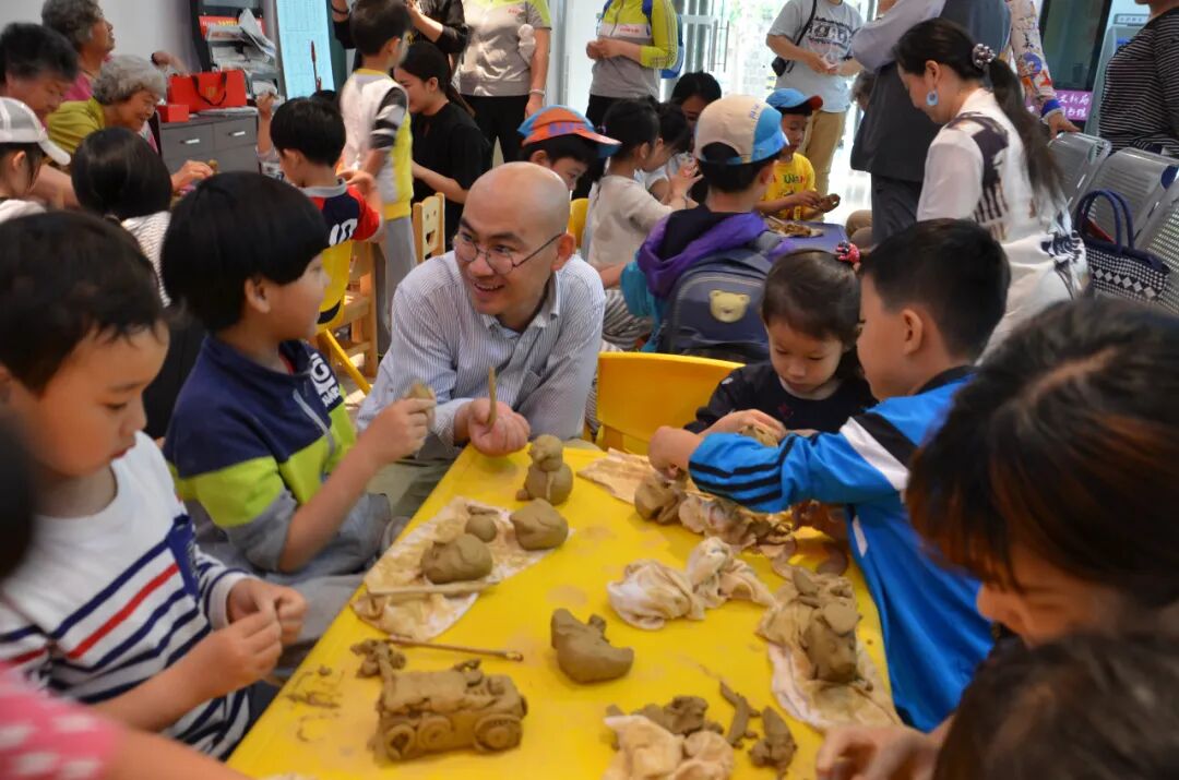 王程祥帶領青島大學美術學院的大學生志愿者在市南區珠海路街道和小朋友們一起玩泥塑。