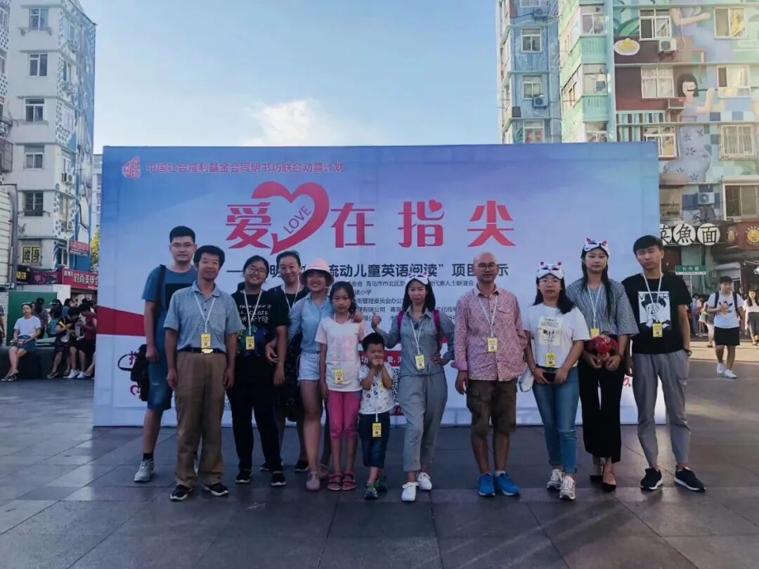 2018年99公益日期間,“流動兒童英語閱讀項目”在有關部門支持下在臺東三路步行街舉辦公開募捐和推廣活動(右四為王程祥)。