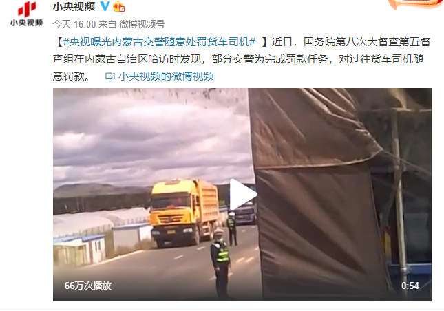 【央視曝光內(nèi)蒙古交警隨意處罰貨車司機(jī)】近日,國(guó)務(wù)院第八次大督查第五督查組在內(nèi)蒙古自治區(qū)暗訪時(shí)發(fā)現(xiàn),部分交警為完成罰款任務(wù),對(duì)過(guò)往貨車司機(jī)隨意罰款。