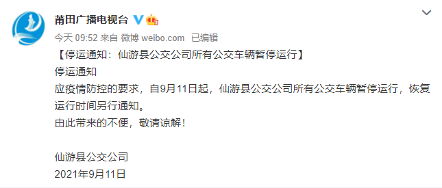 福建莆田仙游縣:9月11日起所有公交車輛暫停運行 2021-09-11 11:53 莆田市廣播電臺官方微博 0 應疫情防控的要求,自9月11日起,仙游縣公交公司所有公交車輛暫停運行,恢復運行時間另行通知。 由此帶來的不便,敬請諒解! 仙游縣公交公司 2021年9月11日 責任編輯:孫源熙