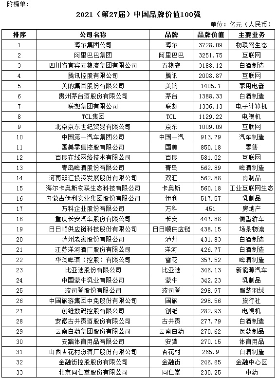 2021(第27屆)中國(guó)品牌價(jià)值100強(qiáng)研究報(bào)告日前揭曉,海爾品牌價(jià)值3728.09億元,連續(xù)20年居首,其后是阿里巴巴3251.75億元、五糧液3188.12億元、騰訊2008.87億元、美的1405.70億元、茅臺(tái)1388.33億元、聯(lián)想1336.13億元、TCL1129.22億元。