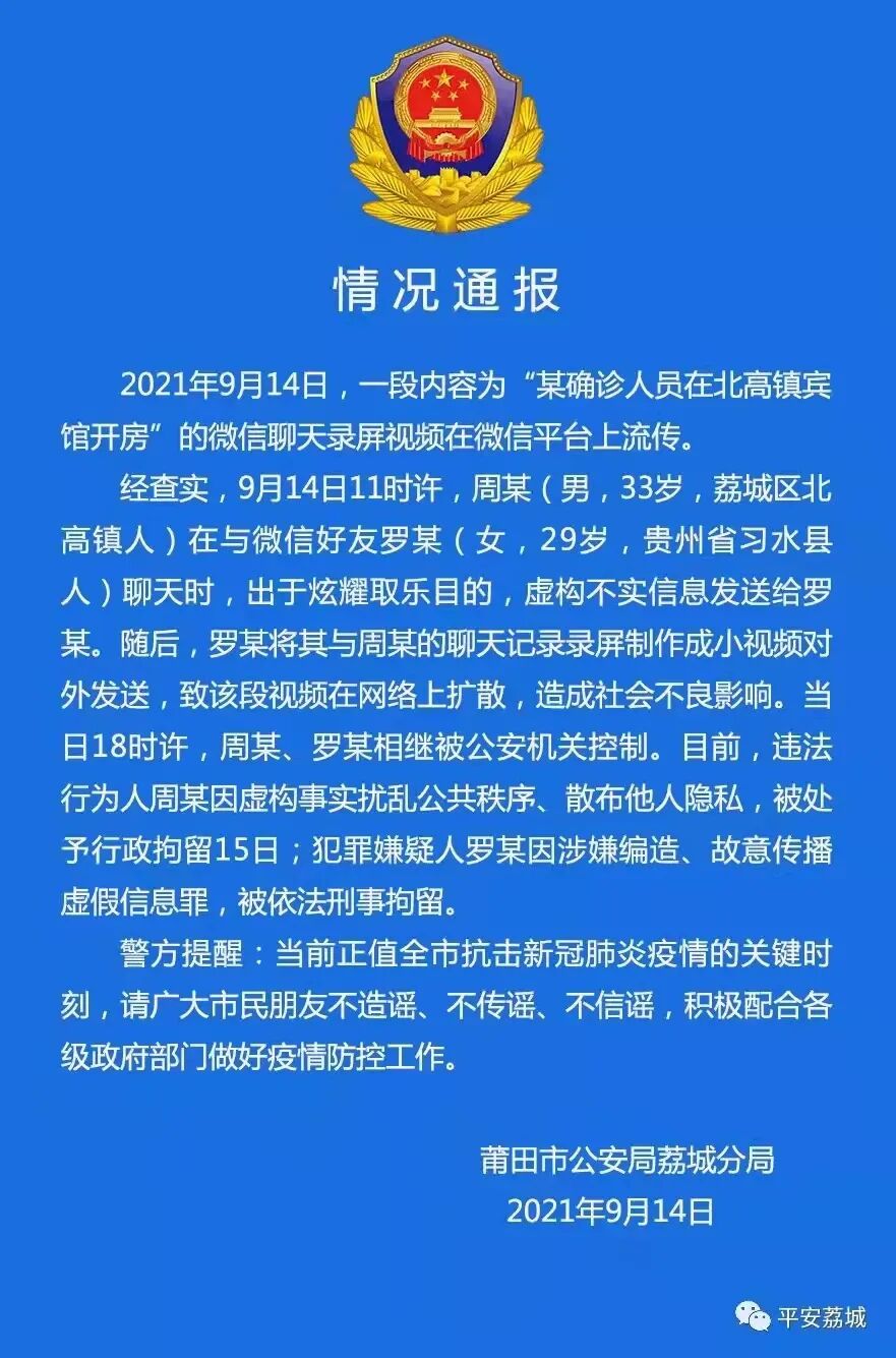 2021年9月14日,一段內容為“某確診人員在北高鎮賓館開房”的微信聊天錄屏視頻在微信平臺上流傳。