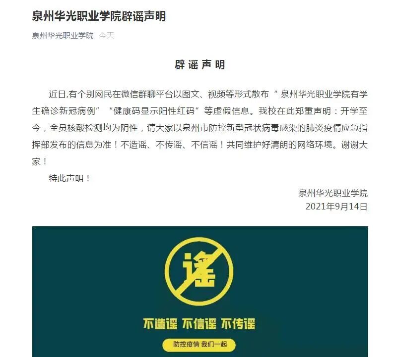 近日,有個別網民在微信群聊平臺以圖文、視頻等形式散布“ 泉州華光職業學院有學生確診新冠病例”“健康碼顯示陽性紅碼”等虛假信息。我校在此鄭重聲明:開學至今,全員核酸檢測均為陰性,請大家以泉州市防控新型冠狀病毒感染的肺炎疫情應急指揮部發布的信息為準!不造謠、不傳謠、不信謠!共同維護好清朗的網絡環境。謝謝大家!