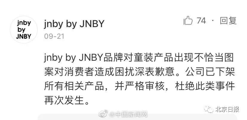 對此,江南布衣集團旗下童裝品牌官方賬號“jnby by JNBY” 在網友貼文下回復稱:對童裝產品出現不恰當圖案對消費者造成困擾深表歉意。公司已下架所有相關產品,并嚴格審核,杜絕此類事件再次發生。