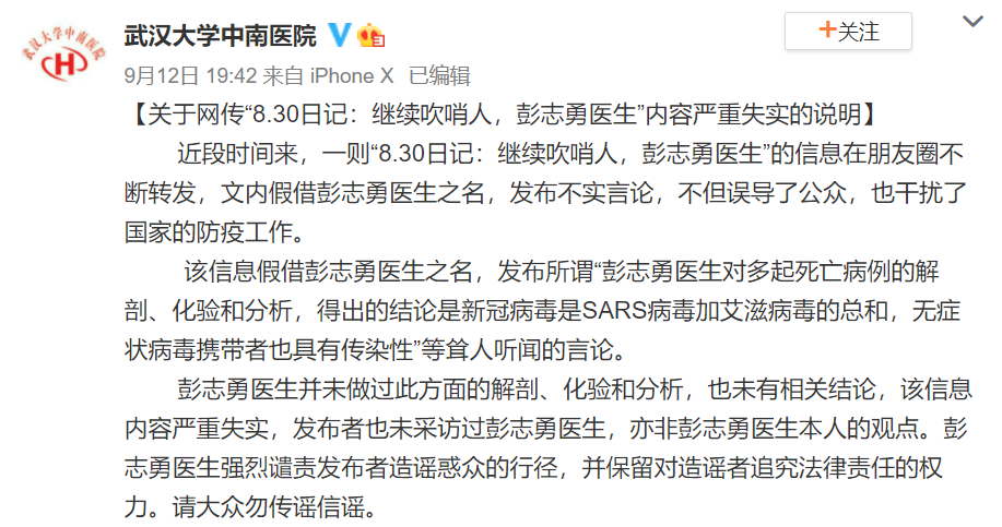 12日晚間,@武漢大學中南醫院 發文稱,網傳“8?30日記:繼續吹哨人,彭志勇醫生”內容嚴重失實,說明如下: