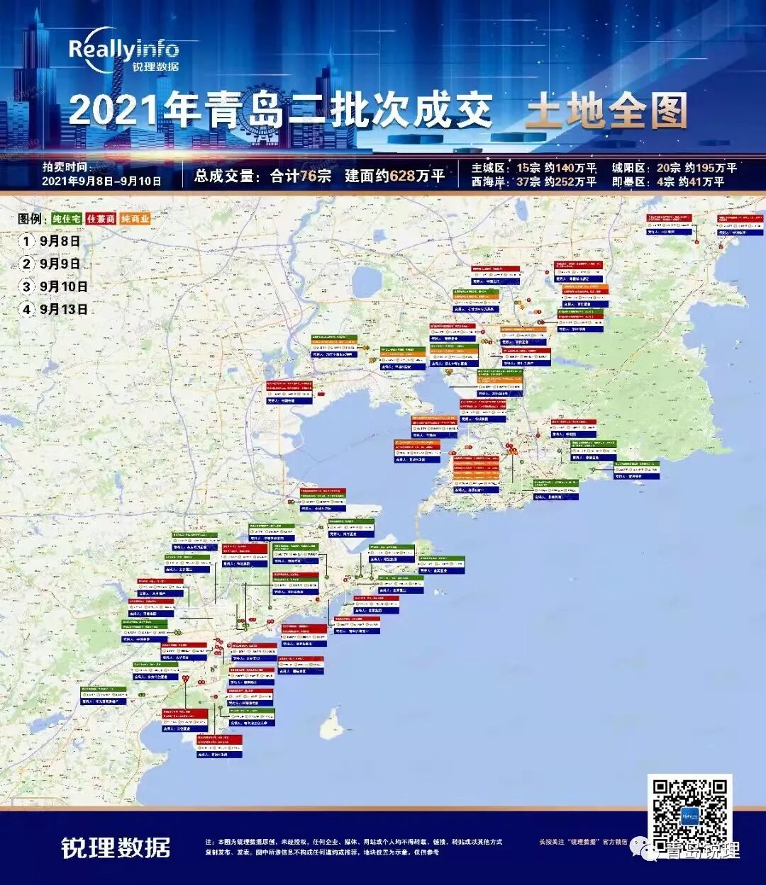 青島二批次共掛牌87宗地,成交76宗,另外高新區8宗終止,還有3宗地塊臨時中止出讓。成交總建面628萬㎡,成交總價279億,較第一次土拍多15宗地,總建面上漲89%,總金額上漲106%。除了熔斷的西海岸4宗地,其他均為底價成交。