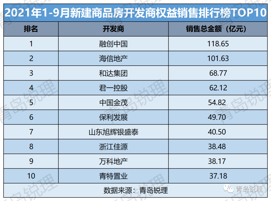 在2021年1-9月新建商品房開發商權益銷售排行榜上,融創中國依然“稱霸”,權益銷售額118.65億。其中融創中心、融創阿朵小鎮、融創雙創小鎮等項目,與合作方按照股權進行了拆分。