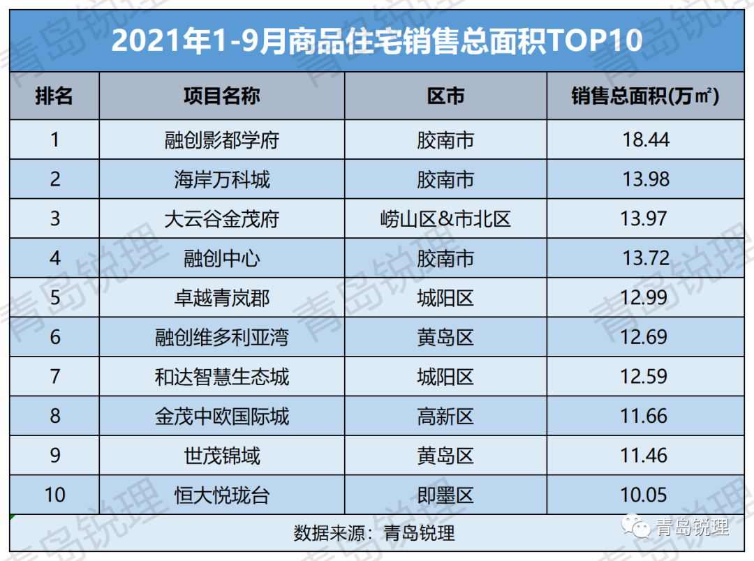 2021年1-9月商品住宅銷售總面積TOP10中:融創影都學府以簽約18.44萬㎡、1447套位居榜首。