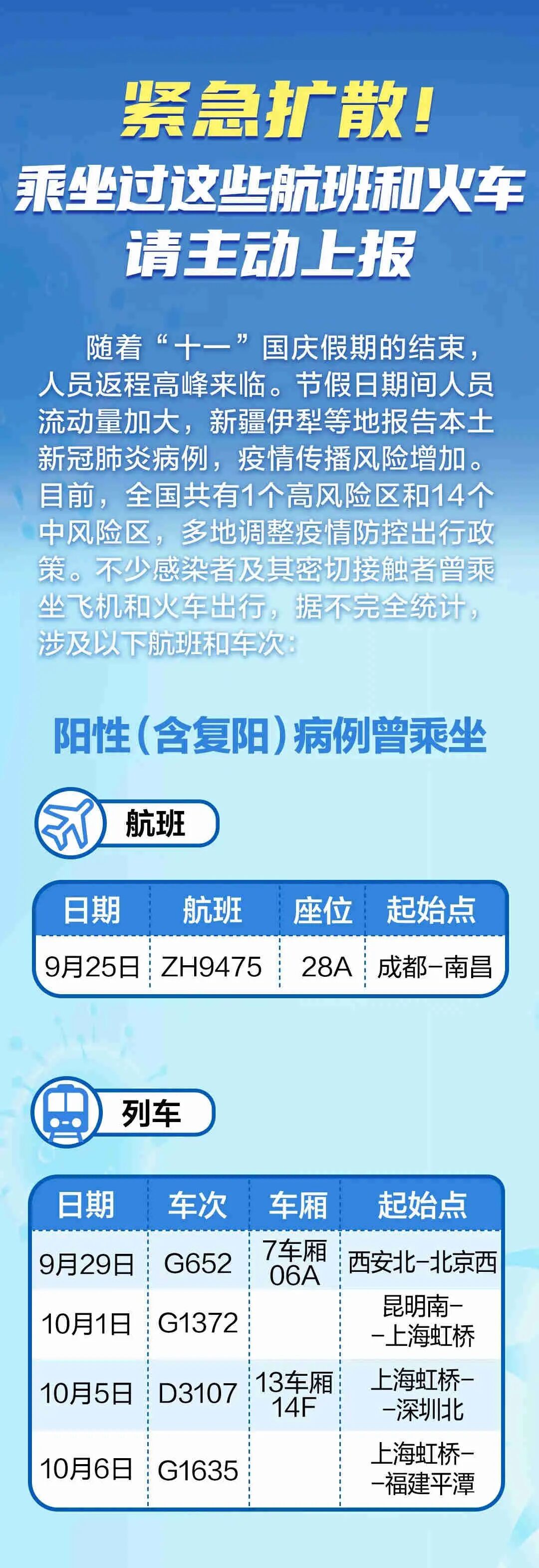 目前,全國共有1個高風(fēng)險區(qū)和14個中風(fēng)險區(qū),多地調(diào)整疫情防控出行政策。不少感染者及其密切接觸者曾乘坐飛機和火車出行,據(jù)不完全統(tǒng)計,涉及以下航班和車次: