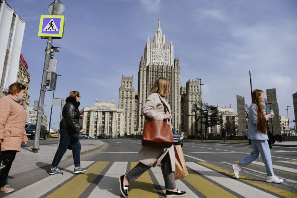 4月16日,在俄羅斯首都莫斯科,行人從俄羅斯外交部大樓附近走過。(新華社發,葉甫蓋尼·西尼岑攝)