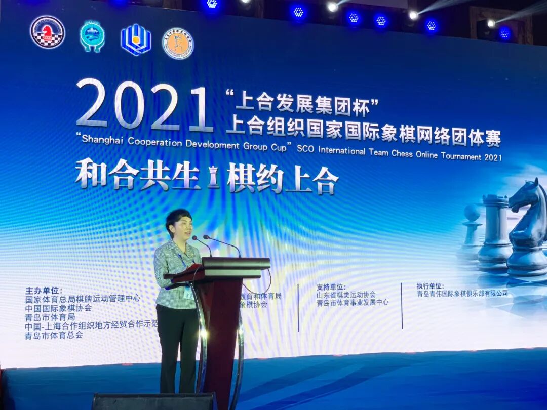 亞洲國際象棋聯合會副主席、國家體育總局棋牌運動管理中心國際象棋部主任田紅衛也對青島國際象棋的發展給予了肯定。她在致辭時說道:“青島國際象棋經過多年耕耘,取得了令人矚目的成績,今年又創辦了膠東五市國際象棋爭霸賽并成立了膠東五市發展聯盟。希望青島及膠州在與上合組織成員國之間的交流中,充分利用國際象棋的獨特作用,積極助推膠州全面融入國家“一帶一路”建設,打造“一帶一路”國際產能合作平臺和文化合作平臺。”
