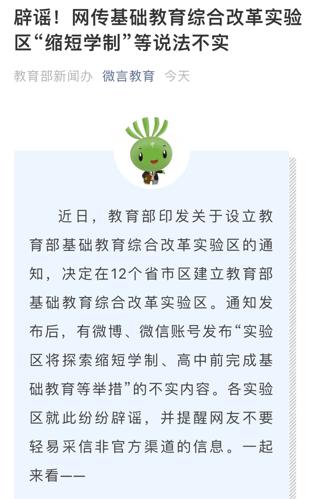 網傳12個基礎教育綜合改革實驗區將縮短學制?