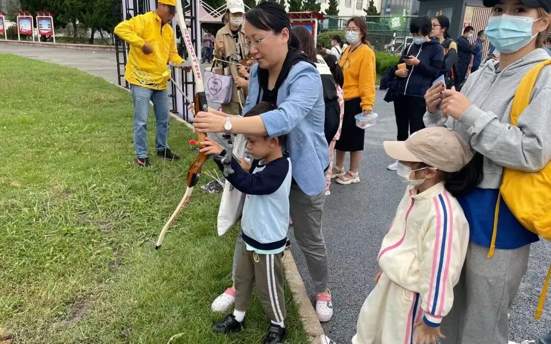 “瞄準(zhǔn),拉滿”,咻的一聲,小箭在我的手中飛了起來,雖然沒有成功的射到箭靶上面,但是我毫不氣餒,第二箭,第三箭,6環(huán)!射中啦!