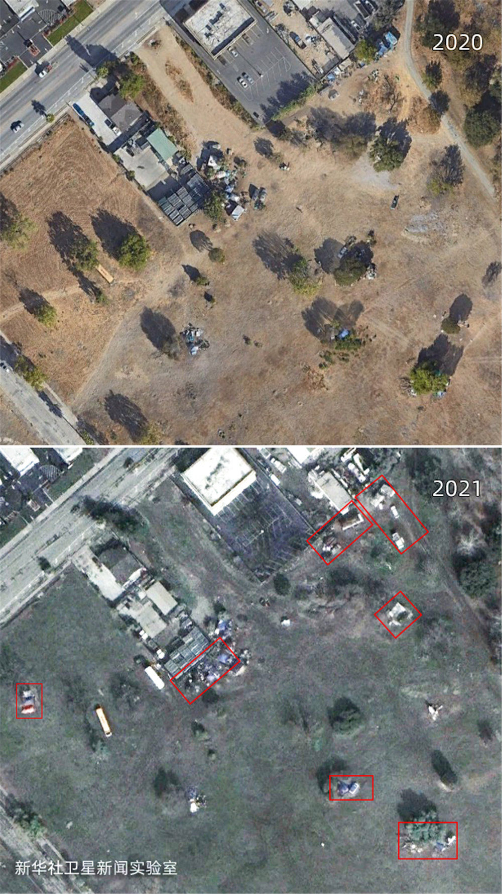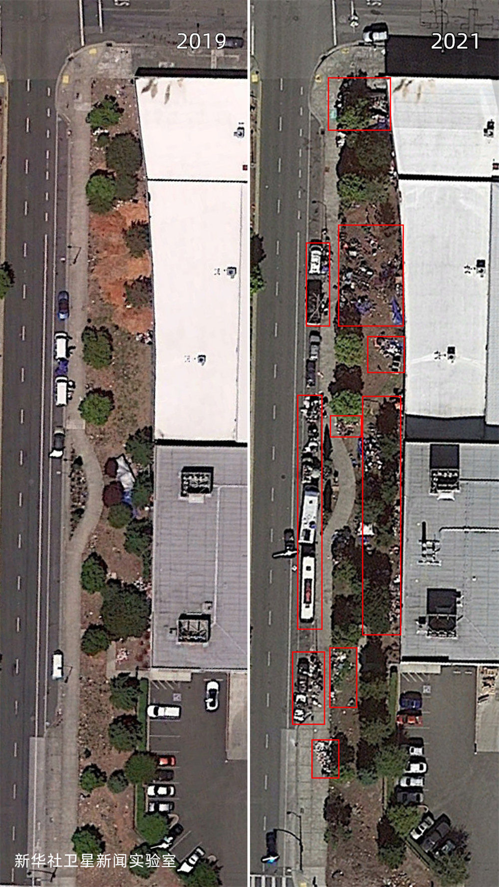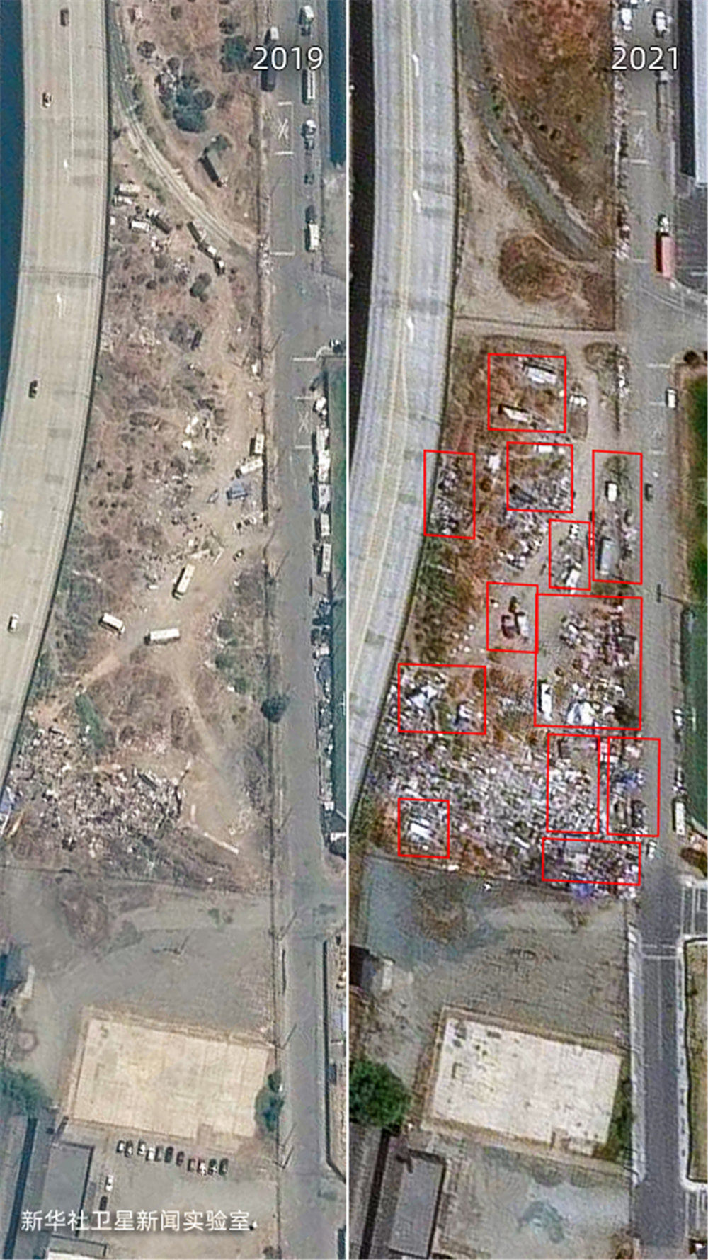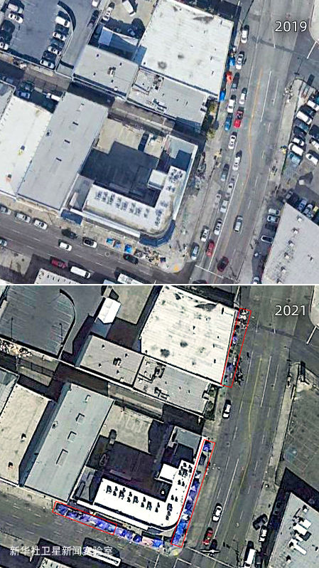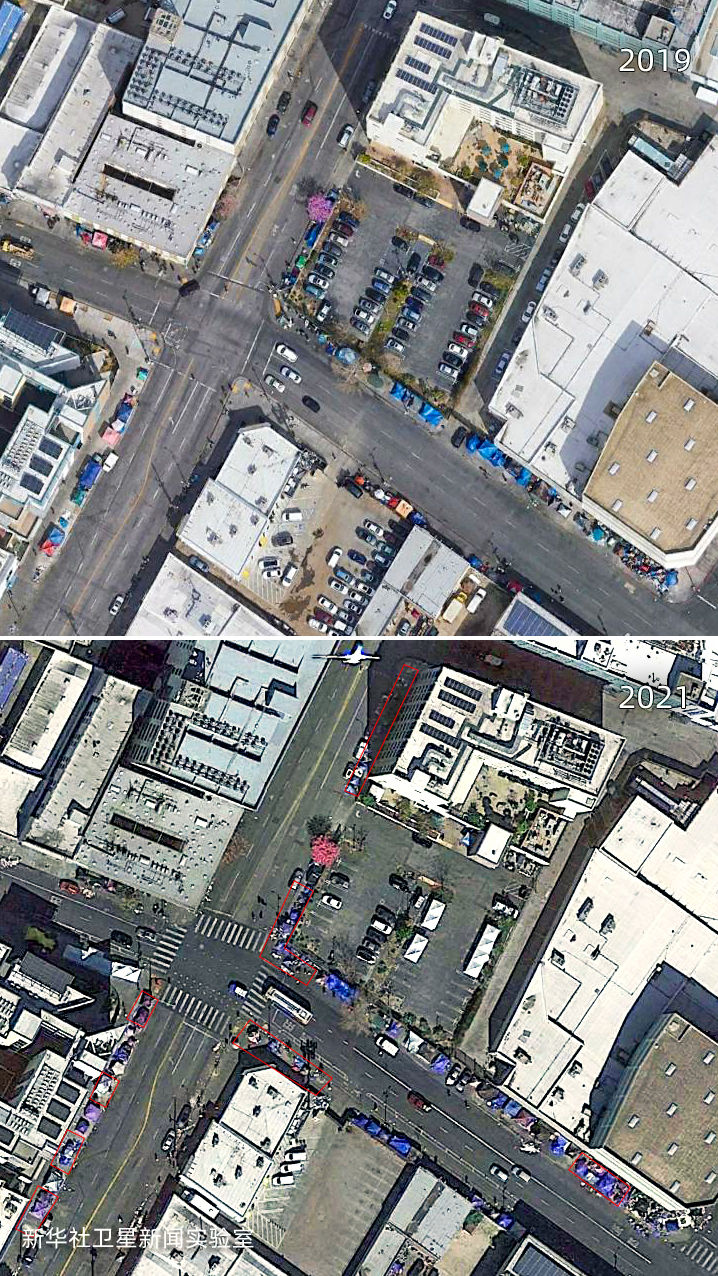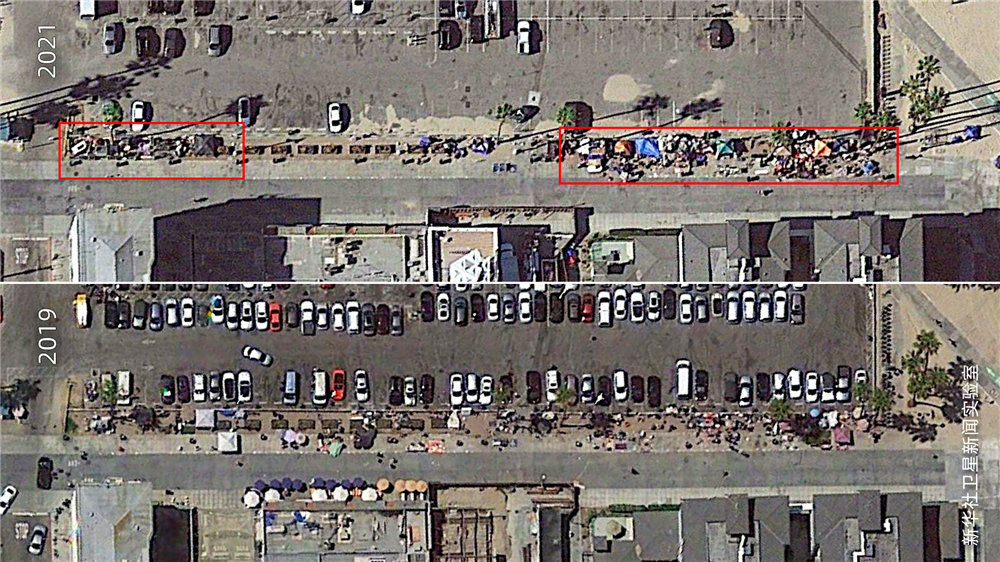 雖然美國聯邦政府在2020年春季就頒布了禁止驅逐房客的疫情救助法案,但新華社衛星新聞實驗室的觀測結果顯示:相較2019年,美國城市中疑似無家可歸者搭建的帳篷等臨時居住設施面積增加了約4倍,部分地點增加了超過10倍。