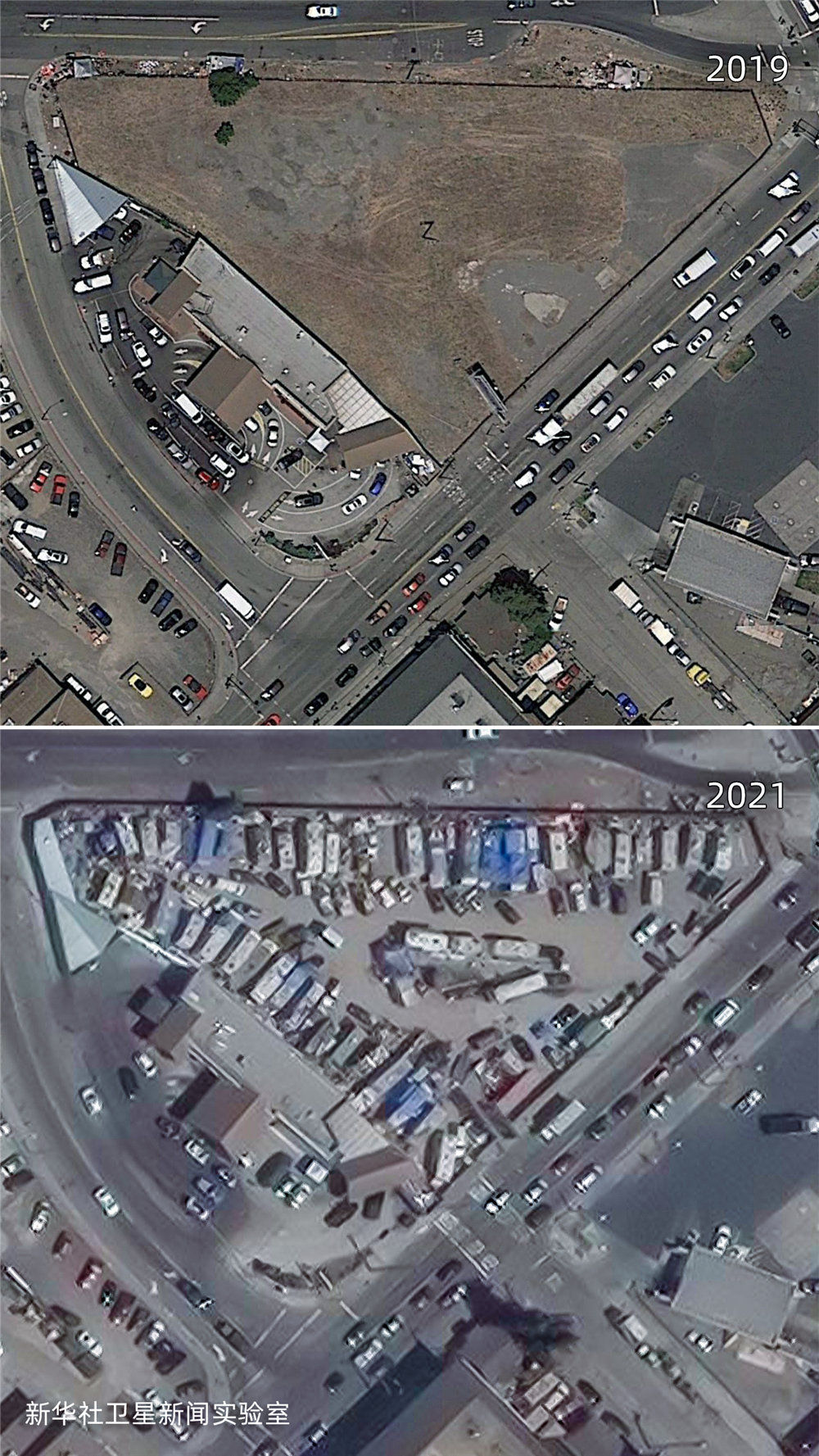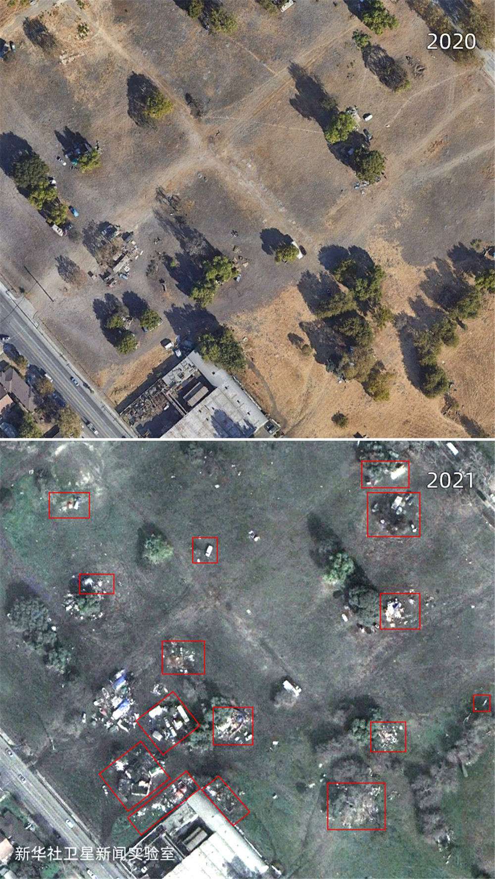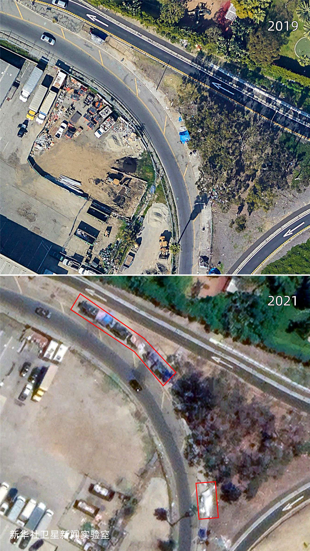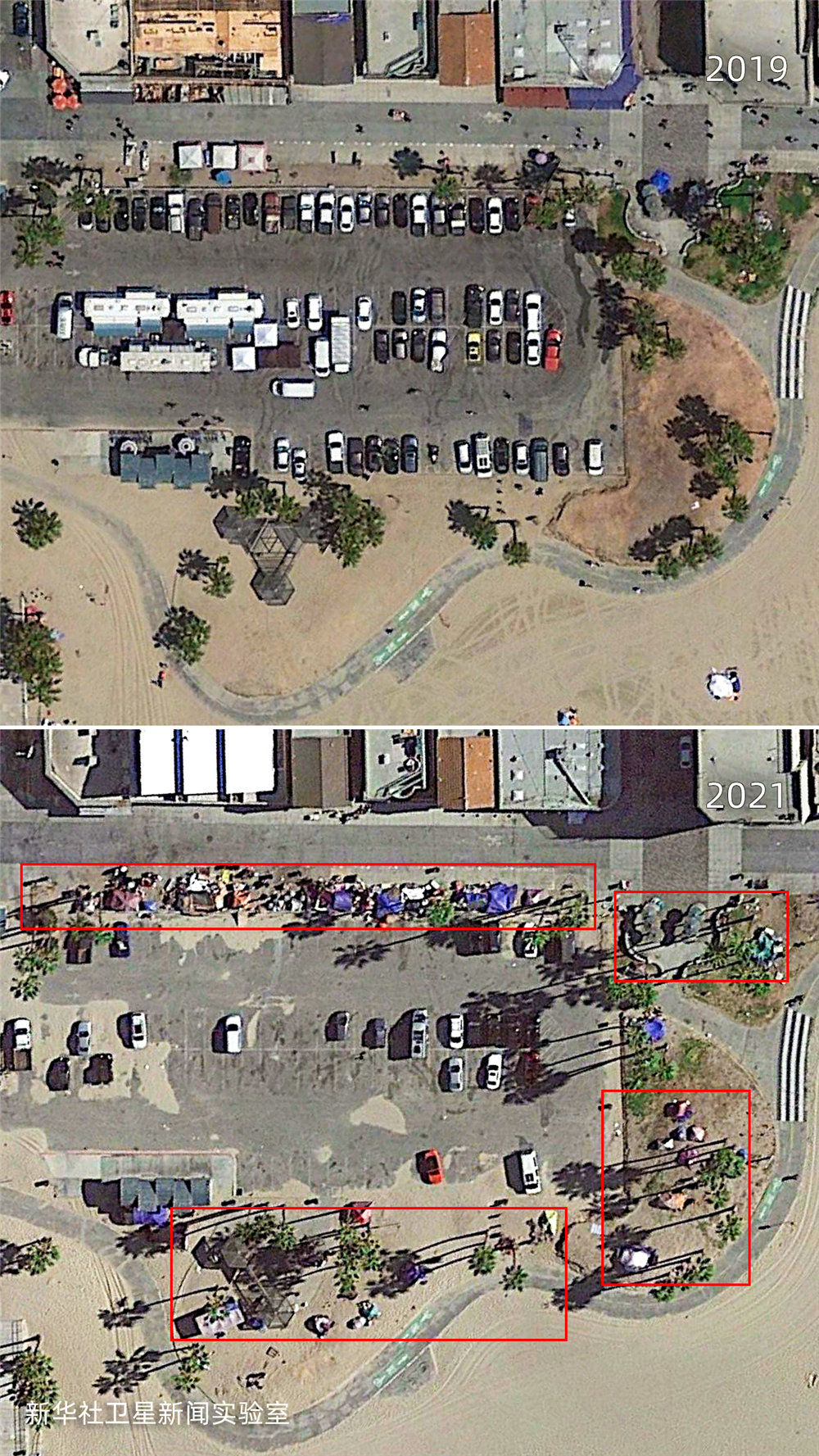 雖然美國聯邦政府在2020年春季就頒布了禁止驅逐房客的疫情救助法案,但新華社衛星新聞實驗室的觀測結果顯示:相較2019年,美國城市中疑似無家可歸者搭建的帳篷等臨時居住設施面積增加了約4倍,部分地點增加了超過10倍。