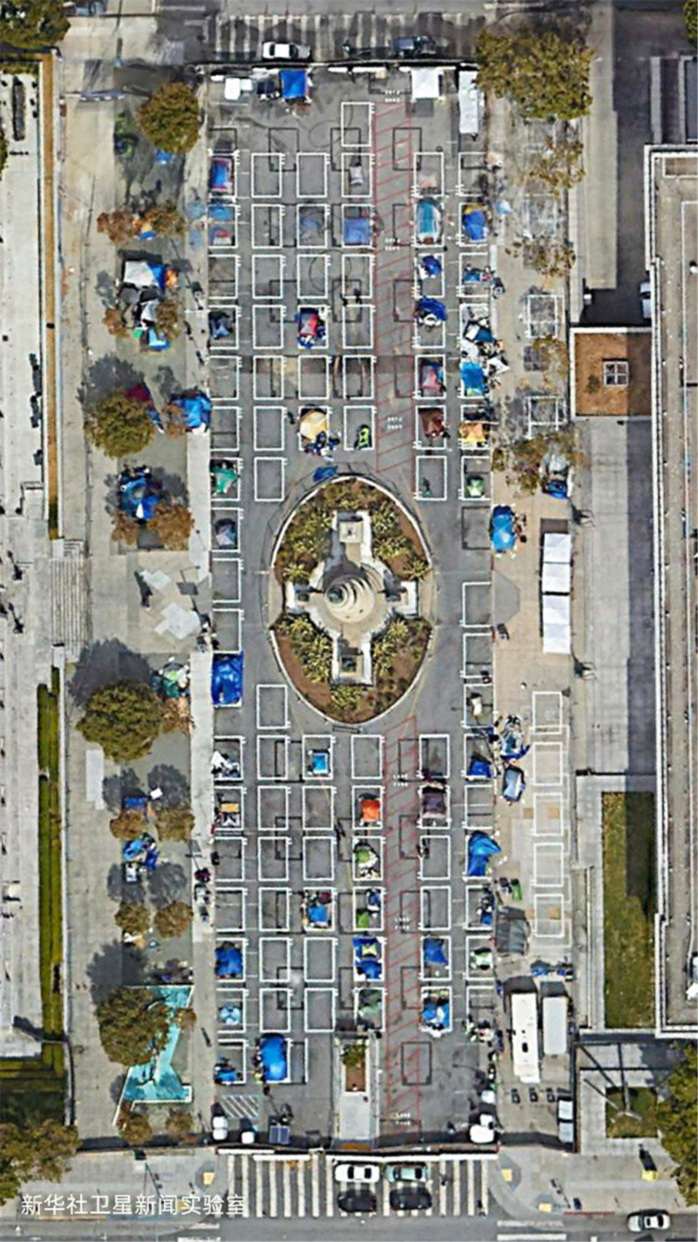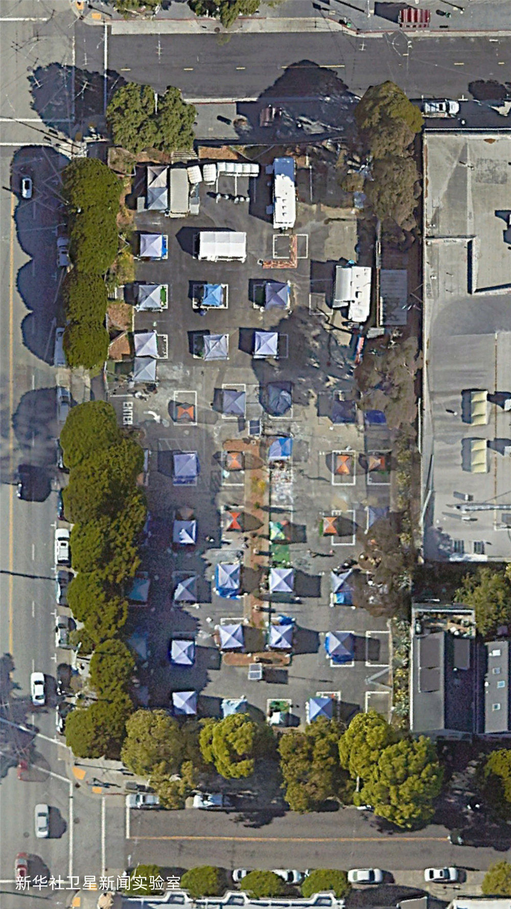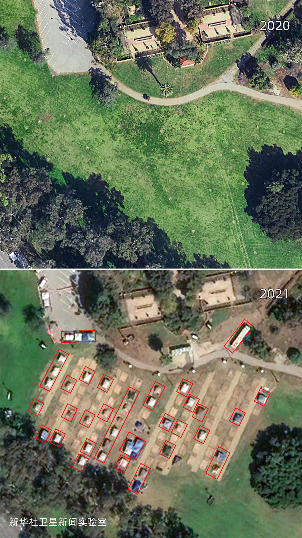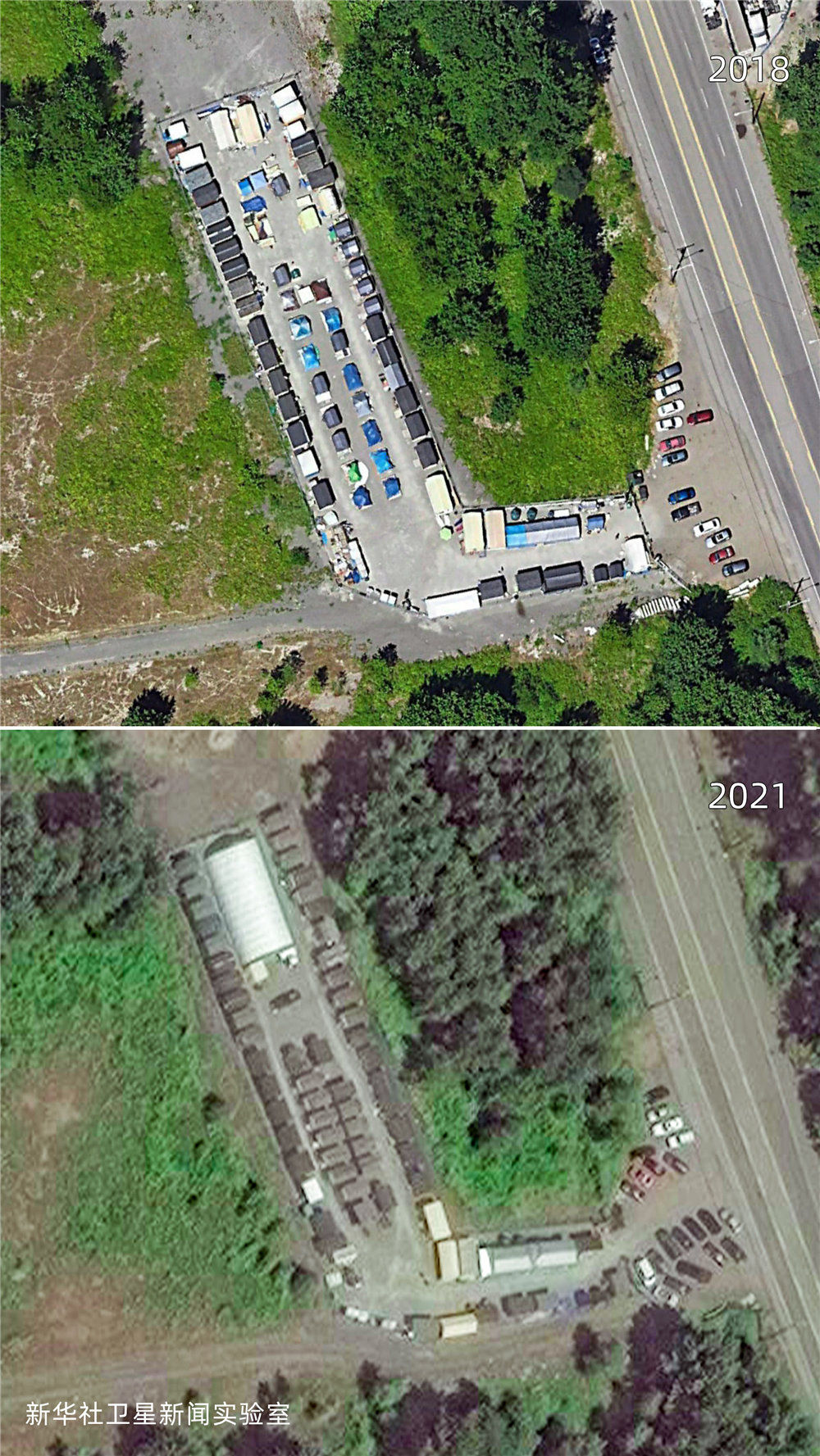 雖然美國聯邦政府在2020年春季就頒布了禁止驅逐房客的疫情救助法案,但新華社衛星新聞實驗室的觀測結果顯示:相較2019年,美國城市中疑似無家可歸者搭建的帳篷等臨時居住設施面積增加了約4倍,部分地點增加了超過10倍。