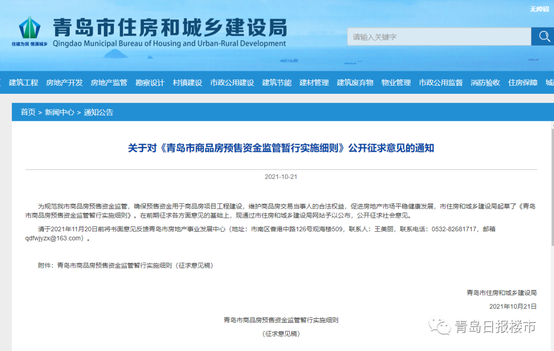 關(guān)于對(duì)《青島市商品房預(yù)售資金監(jiān)管暫行實(shí)施細(xì)則》公開征求意見的通知